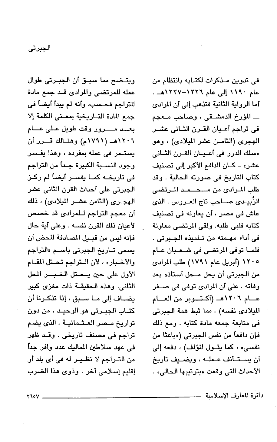 في تدوين مذكرات لكتابه بانتظام من عام 1190 إلى عام 1226 - 1227 هـ. أما الرواية الثانية فتذهب إلى أن المرادى -المؤرخ الدمشقي، وصاحب معجم في تراجم أعيان القرن الثاني عشر الهجرى (الثامن عشر الميلادي)، وهو "سلك الدرر في أعيان القرن الثاني عشر" -كان الدافع الأكبر إلى تصنيف كتاب التاريخ في صورته الحالية. وقد طلب المرادى من محمد المرتضى الزبيدى صاحب تاج العروس، الذي عاش في مصر، أن يعاونه في تصنيف كتابه فلبى طلبه. ولقى المرتضى معاونة في أداء مهمته من تلميذه الجبرتى. فلما توفى المرتضى في شعبان عام 1205 (أبريل عام 1791) طلب المرادى من الجبرتى أن يحل محل أستاذه بعد وفاته. على أن المرادى توفى في صفر عام 1206 هـ (أكتوبر من العام الميلادي نفسه)، مما ثبط همة الجبرتى في متابعة جمعه مادة كتابه. ومع ذلك فإن دافعًا من نفس الجبرتى ("باعثا من نفسى"، كما يقول المؤلف)، دفعه إلى أن يستانف عمله، ويضيف تاريخ الأحداث التي وقعت "بترتيبها الحالى". ويتضح مما سبق أن الجبرتى طوال عمله للمرتضى والمرادى قد جمع مادة للتراجم فحسب، وأنه لم يبدأ أيضًا في جمع المادة التاريخية بمعنى الكلمة إلا بعد مرور وقت طويل على عام 1206 هـ (1719 م) وهنالك قرر أن يستمر في عمله بمفرده، وهذا يفسر وجود النسبة الكبيرة جدًّا من التراجم في تاريخه كما يفسر أيضًا لم ركز الجبرتى على أحداث القرن الثاني عشر الهجرى (الثامن عشر الميلادي)، ذلك أن معجم التراجم للمرادى قد خصص لأعيان ذلك القرن نفسه. وعلى آية حال فإنه ليس من قبيل المصادفة المحض أن يسمى تاريخ الجبرتى باسم "التراجم والأخبار"، لأن التراجم تحتل المقام الأول على حين يحتل الخبر المحل الثاني. وهذه الحقيقة ذات مغزى كبير يضاف إلى ما سبق، إذا تذكرنا أن كتاب الجبرتى هو الوحيد، من دون تواريخ مصر العثمانية، الذي يضم تراجم في مصنف تاريخي. وقد ظهر في عهد سلاطين المماليك عدد وافر جدا من التراجم لا نظير له في أي بلد أو إقليم إسلامي آخر. وذوى هذا الضرب