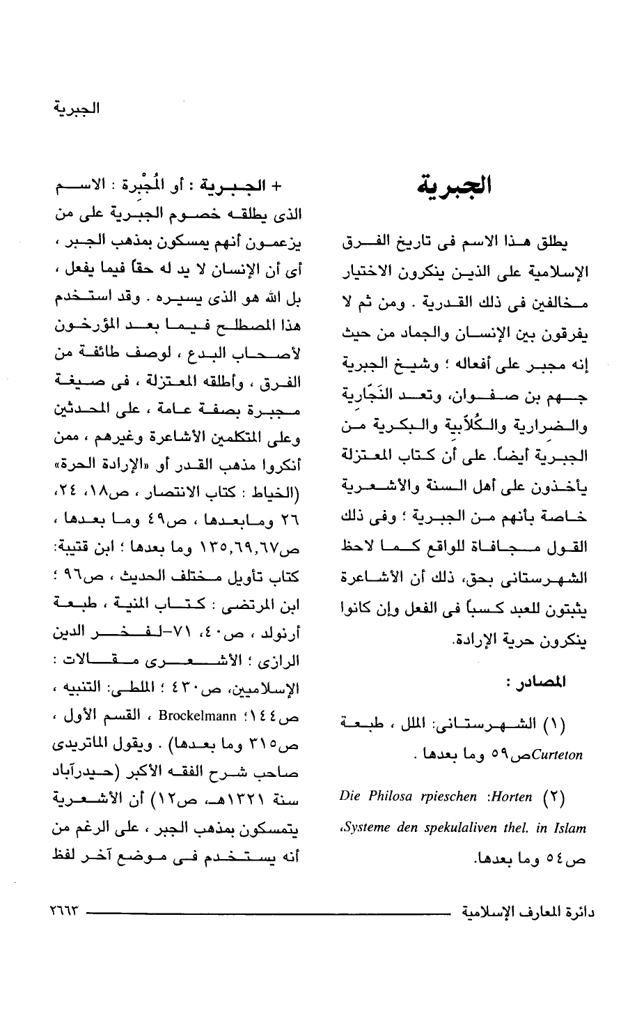 + الجبرية: أو المُجْبرة: الاسم الذي يطلقه خصوم الجبرية على من يزعمون أنهم يمسكون بمذهب الجبر، أي أن الإنسان لا يد له حقا فيما يفعل، بل الله هو الذي يسيره. وقد استخدم هذا المصطلح فيما بعد المؤرخون لأصحاب البدع، لوصف طائفة من الفرق، وأطلقه المعتزلة، في صيغة مجبرة بصفة عامة، على المحدثين وعلى المتكلمين الأشاعرة وغيرهم، ممن أنكروا مذهب القدر أو "الإرادة الحرة" (الخياط: كتاب الانتصار، ص 18، 24, 26 وما بعدها، ص 49 وما بعدها، 67 , 69, 135، وما بعدها؛ ابن قتيبة: كتاب تأويل مختلف الحديث، ص 96؛ ابن المرتضى: كتاب المنية، طبعة أرنولد، ص 40، 71 - لفخر الدين الرازي؟ الأشعرى مقالات: الإسلاميين، ص 430؛ الملطى: التنبيه، ص 144 Brockelmann. القسم الأول ص 315 وما بعدها). ويقول الماتريدى صاحب شرح الفقه الأكبر) حيدرآباد سنة 1321 هـ، ص 12) أن الأشعرية يتمسكون بمذهب الجبر، على الرغم من أنه يستخدم في موضع آخر لفظ