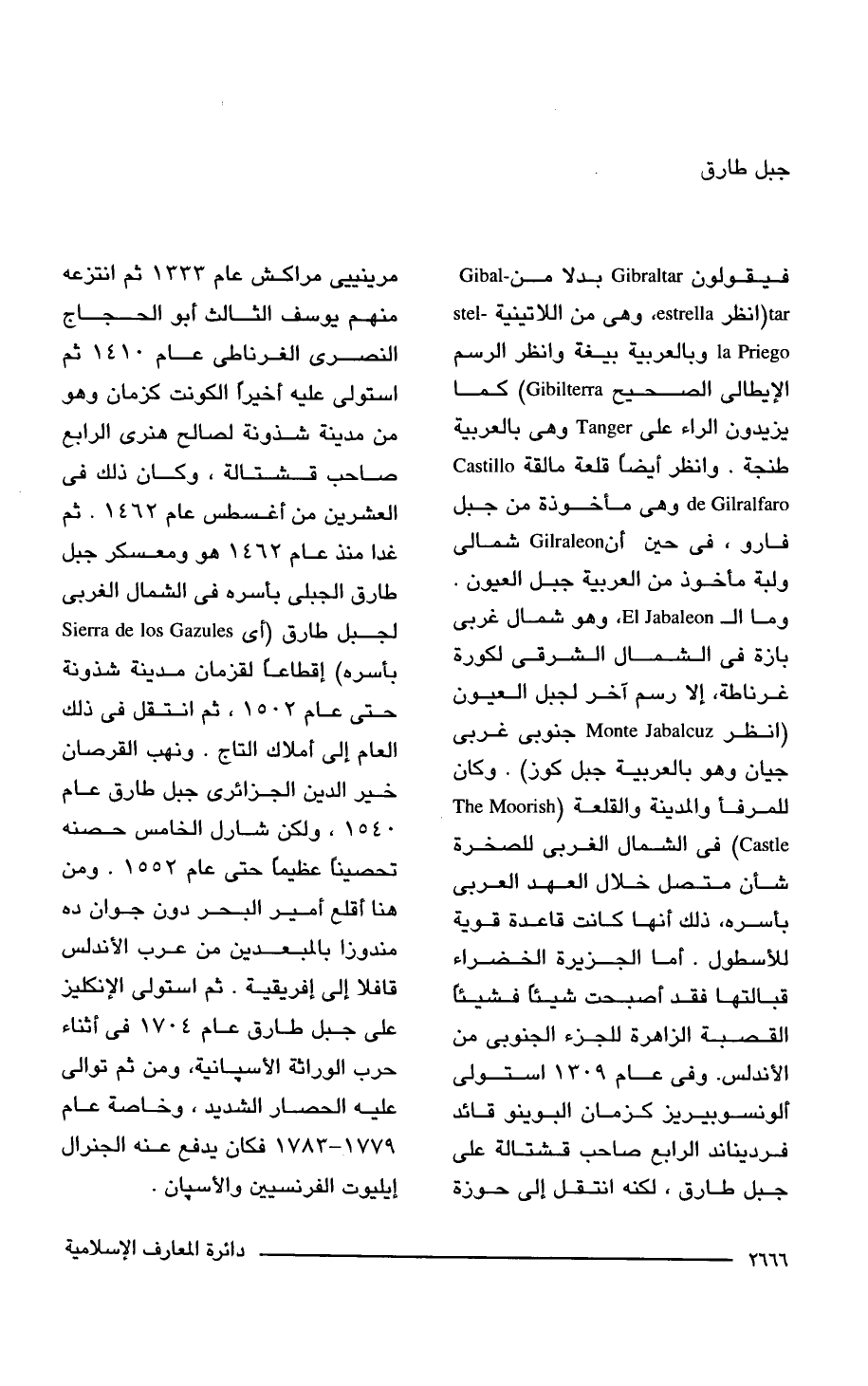 فيقولون Gibraltar بدلا من tar (انظر , estrella وهي من اللاتينية la Priego وبالعربية بيغة وانظر الرسم الإيطالى الصحيح Gibilterra (كما يزيدون الراء على Tanger هي بالعربية طنجة. وانظر أيضا قلعة مالقة Castillo de Gilralfarc وهي مأخوذة من جبل فارو، في حين أن Cilraleon شمالي ولبة مأخوذ من العربية جبل العيون. وما الـ El Jahaleon, وهو شمال غربي بازة في الشمال الشرقي لكورة غرناطة، إلا رسم آخر لجبل العيون (انظر Monte Jabalcuz جنوبي غربي جيان وهو بالعربية جبل كوز). وكان للمرفأ والمدينة والقلعة) The Moorish Castle) في الشمال الغربي للصخرة شأن متصل خلال العهد العربي باسره، ذلك أنها كانت قاعدة قوية للأسطول. أما الجزيرة الخضراء قبالتها فقد أصبحت شيئًا فشيئا القصبة الزاهرة للجزء الجنوبي من الأندلس. وفي عام 1309 استولى ألونسوبيريز كزمان البوينو قائد فرديناند الرابع صاحب قشتالة على جبل طارق، لكنه انتقل إلى حوزة مرينييى مراكش عام 1333 ثم انتزعه منهم يوسف الثالث أبوالحجاج النصرى الغرناطى عام 1410 استولى عليه أخيرلم الكونت كزمان وهو من مدينة شذونة لصالح هنرى الرابع صاحب قشتالة، وكان ذلك في العشرين من أغسطس عام 1462. ثم غدا منذ عام 1462 هو ومعسكر جبل طارق الجبلى بأسره في الشمال الغربي لجبل طارق (أي Sierra de los G? azulec بأسره) إقطاعا لقزمان مدينة شذونة حتى عام 1540، ثم انتقل في ذلك العام إلى أملاك التاج. ونهب القرصان خير الدين الجزائرى جبل طارق عام 1540، ولكن شارل الخامس حصنه تحصينا عظيما حتى عام 1552. ومن هنا أقلع أمير البحر دون جوان ده مندوزا بالمبعدين من عرب الأندلس قافلا إلى إفريقية. ثم استولى الإنكليز على جبل طارق عام 1704 في أثناء حرب الوراثة الأسبانية، ومن ثم توالى عليه الحصار الشديد، وخاصة عام 1779 - 1783 فكان يدفع عنه الجنرال إيليوت الفرنسيين والأسبان.