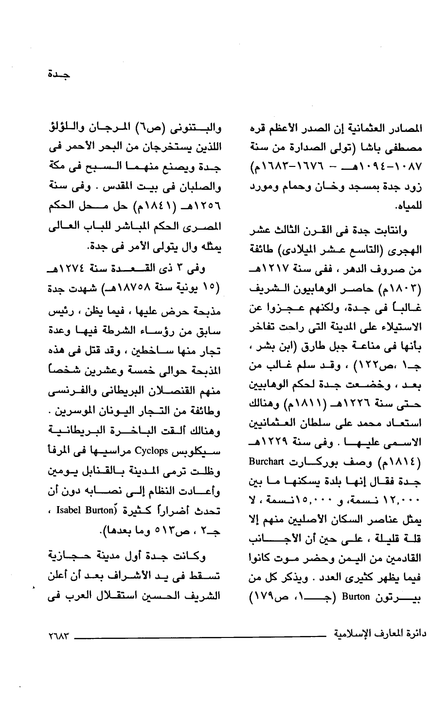 وانتابت جدة في القرن الثالث عشر الهجرى (التاسع عشر الميلادي) طائفة من صروف الدهر، ففي سنة 1217 هـ- (1803 م) حاصر الوهابيون الشريف غالبًا في جدة، ولكنهم عجزوا عن الاستيلاء على المدينة التي راحت تفاخر بأنها في مناعة جبل طارق (ابن بشر، ج 1، ص 122)، وقد سلم غالب من بعد، وخضعت جدة لحكم الوهابيين حتى سنة 1226 هـ (1811 م) وهنالك استعاد محمد على سلطان العثمانيين الاسمى عليها. وفي سنة 1229 هـ- (1814 م) وصف بوركارت Burchart جدة فقال إنها بلدة يسكنها ما بين 12.000 نسمة، و 15.000 نسمة، لا يمثل عناصر السكان الأصليين منهم إلا قلة قليلة، على حين أن الأجانب القادمين من اليمن وحضر موت كانوا فيما يظهر كثيرى العدد. ويذكر كل من بيرتون Burton (ج 1، ص 179) والبتنونى (ص 6) المرجان واللؤلؤ اللذين يستخرجان من البحر الأحمر في جدة ويصنع منهما السبح في مكة والصلبان في بيت المقدس. وفي سنة 1256 هـ (1841 م) حل محل الحكم المصري الحكم المباشر للباب العالى يملكه وال يتولى الأمر في جدة.
