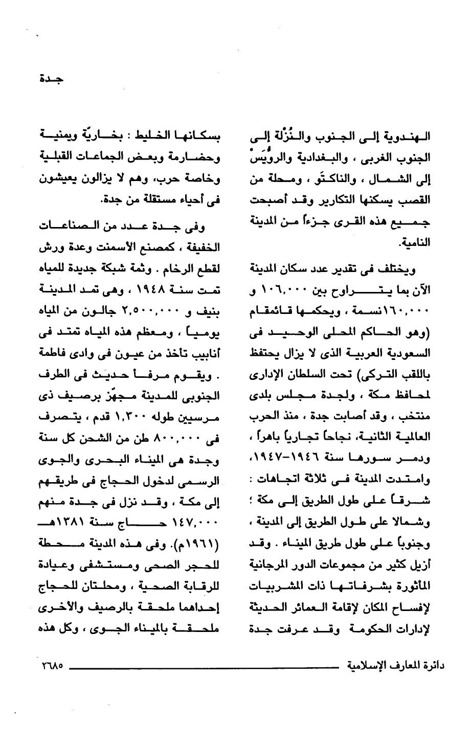 ويختلف في تقدير عدد سكان المدينة الآن بما يتراوح بين 106.000 و 160.000 نسمة، ويحكمها قائمقام (وهو الحاكم المحلى الوحيد في السعودية العربية الذي لا يزال يحتفظ باللقب التركى) تحت السلطان الإدارى لمحافظ مكة، ولجدة مجلس بلدى منتخب، وقد لم صابت جدة، منذ الحرب العالمية الثانية، نجاحا تجاريا باهرًا، ودمر سورها سنة 1946 - 1947، وامتدت المدينة في ثلاثة اتجاهات: شرقا على طول الطريق إلى مكة؛ وشمالا على طول الطريق إلى المدينة، وجنوبا على طول طريق الميناء. وقد أزيل كثير من مجموعات الدور المرجانية الماثورة بشرفاتها ذات المشربيات لإفساح المكان لإقامة العمائر الحديثة لادارات الحكومة وقد عرفت جدة بسكانها الخليط: بخارئة ويمنية وحضارمة وبعض الجماعات القبلية وخاصة حرب، وهم لا يزالون يعيشون في أحياء مستمَلة من جدة.