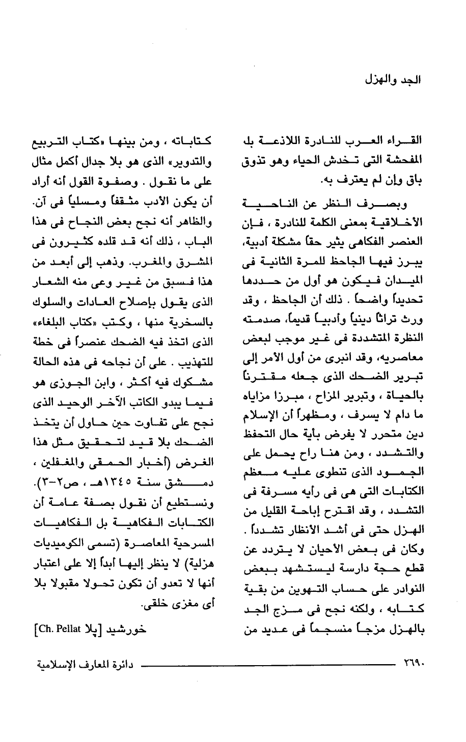 وبصرف النظر عن الناحية الأخلاقية بمعنى الكلمة للنادرة، فإن العنصر الفكاهى يثير حقًّا مشكلة أدبية، يبرز فيها الجاحظ للمرة الثانية في الميدان فيكون هو أول من حددها تحديدًا واضحًا. ذلك أن الجاحظ، وقد ورث تراثًا دينيًّا وأدبيًا قديمًا، صدمته النظرة المتشددة في غير موجب لبعض معاصريه، وقد انبرى من أول الأمر إلى تبرير الضحك الذي جعله مقترنًا بالحياة، وتبرير المزاح، مبرزا مزاياه ما دام لا يسرف، ومظهرًا أن الإسلام دين متحرر لا يفرض بأية حال التحفظ والتشدد، ومن هنا راح يحمل على الجمود الذي تنطوى عليه معظم الكتابات التي هي في رأيه مسرفة في التشدد، وقد اقترح إباحة القليل من الهزل حتى في أشد الأنظار تشددًا. وكان في بعض الأحيان لا يتردد عن قطع حجة دارسة ليستشهد ببعض النوادر على حساب التهوين من بقية كتابه، ولكنه نجح في مزج الجد بالهزل مزجًا منسجمًا في عديد من كتاباته، ومن بينها "كتاب التربيع والتدوير" الذي هو بلا جدال أكمل مثال على ما نقول. وصفوة القول أنه أراد أن يكون الأدب مثقفًا ومسليًا في آن. والظاهر أنه نجح بعض النجاح في هذا الباب، ذلك أنه قد قلده كثيرون في المشرق والمغرب. وذهب إلى أبعد من هذا فسبق من غير وعى منه الشعار الذي يقول بإصلاح العادات والسلوك بالسخرية منها، وكتب "كتاب البلغاء" الذي اتخذ فيه الضحك عنصرًا في خطة للتهذيب. على أن نجاحه في هذه الحالة مشكوك فيه أكثر، وابن الجوزي هو فيما يبدو الكاتب الآخر الوحيد الذي نجح على تفاوت حين حاول أن يتخذ الضحك بلا قيد لتحقيق مثل هذا الغرض (أخبار الحمقى والمغفلين، دمشق سنة 1345 هـ، ص 2 - 3).