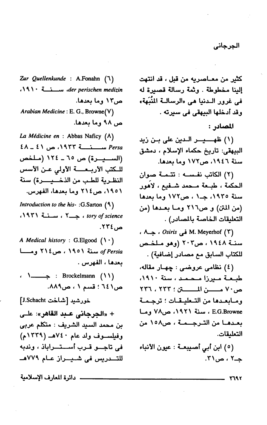 (8) La Medicine en: Abbas Naficy Persa سنة 1933، ص 41 - 48 (السيرة) ص 65 - 124 (ملخص للكتب الأربعة الأولى عن الأسس النظرية للطب من الذخيرة) سنة 1951، ص 214 ما بعدها، الفهرس.