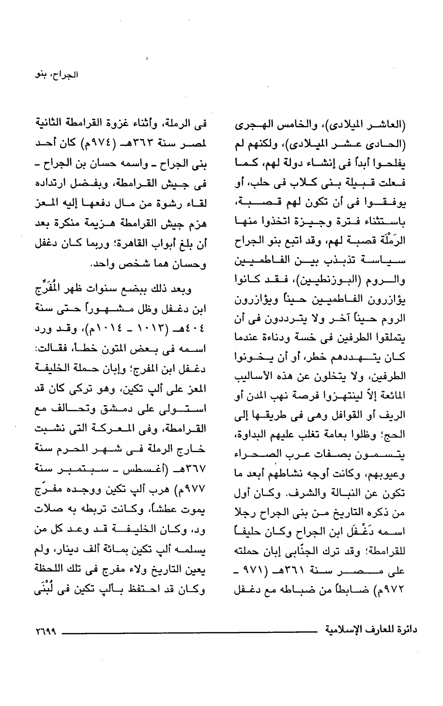 (العاشر الميلادي)، والخامس الهجرى (الحادي عشر الميلادي)، ولكنهم لم يفلحوا أبدًا في إنشاء دولة لهم، كما فعلت قبيلة بنى كلاب في حلب، أو يوفقوا في أن تكون لهم قصبة، باستثناء فترة وجيزة اتخذوا منها الرَمْلَة قصبة لهم، وقد اتبع بنو الجراح سياسة تذبذب بين الفاطميين والروم (البوزنطيين)، فقد كانوا يؤازرون الفاطميين حينًا ويؤازرون الروم حينًا آخر ولا يترددون في أن يتملقوا الطرفين في خسة ودناءة عندما كان يتهددهم خطر، أو أن يخونوا الطرفين، ولا يتخلون عن هذه الأساليب المائعة إلّا لينتهزوا فرصة نهب المدن أو الريف أو القوافل وهي في طريقها إلى الحج؛ وظلوا بعامة تغلب عليهم البداوة، يتسمون بصفات عرب الصحراء وعيوبهم، وكانت أوجه نشاطهم أبعد ما تكون عن النبالة والشرف. وكان أول من ذكره التاريخ من بنى الجراح رجلا اسمه دَغْفَل ابن الجراح وكان حليفًا للقرامطة؛ وقد ترك الجنّابى إبان حملته على مصر سنة 361 هـ (971 - 972 م) ضابطًا من ضباطه مع دغفل في الرملة، وأثناء غزوة القرامطة الثانية لمصر سنة 362 هـ (974 م) كان أحد بنى الجراح-واسمه حسان بن الجراح- في جيش القرامطة، وبفضل ارتداده لقاء رشوة من ما , دفعها إليه المعز هزم جيش القرامطة هزيمة منكرة بعد أن بلغ أبواب القاهرة؛ وربما كان دغفل وحسان هما شخص واحد.