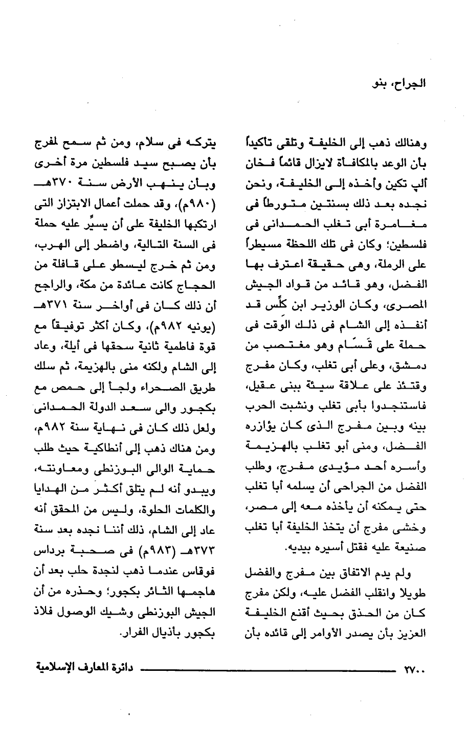 وهنالك ذهب إلى الخليفة وللقى تأكيدًا بأن الوعد بالمكافاة لا يزال قائمًا فخان ألب تكين وأخذه إلى الخليفة، ونحن نجده بعد ذلك بسنتين متورطًا في مغامرة أبي تغلب الحمدانى في فلسطين؛ وكان في دلك اللحظة مسيطرًا على الرملة، وهي حقيقة اعترف بها الفضل، وهو قائد من قواد الجيش المصري، وكان الوزير ابن كِلِّس قد أنفذه إلى الشام في ذلك الوَقت في حملة على قَسّام وهو مغتصب من دمشق، وعلى أبي تغلب، وكان مفرج وقتئذ على علاقة سيئة ببنى عقيل، فاستنجدوا بأبى تغلب ونشبت الحرب بينه وبين مفرج الذي كان يؤازره الفضل، ومنى أبو تغلب بالهزيمة وأسره أحد مؤيدى مفرج، وطلب الفضل من الجراحى أن يسلمه ابا تغلب حتى يمكنه أن يأخذه معه إلى مصر، وخشى مفرج أن يتخذ الخليفة أبا تغلب صنيعة عليه فقتل أسيره بيديه.