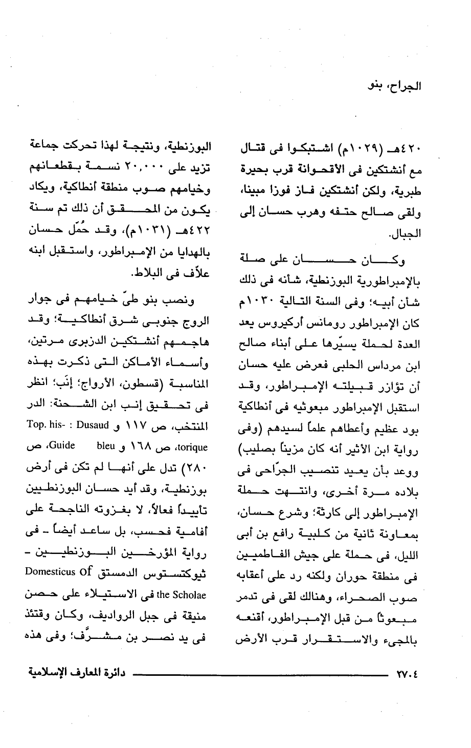 ونصب بنو طيّ خيامهم في جوار الروج جنوبي شرق أنطاكية؛ وقد هاجمهم أنشتكين الدزبرى مرتين، وأسماء الأماكن التي ذكرت بهذه المناسبة (قسطون، الأرواج؛ إنَب؛ انظر في تحقيق إنب ابن الشحنة: الدر المنتخب، ص 117 و Top. his-: Dusaud torique ص 168 و Guide bleu ص 280) تدل على أنها لم تكن في أرض بوزنطية، وقد أيد حسان البوزنطيين تأييدًا فعالًا، لا بغزوته الناجحة على أفامية فحسب، بل ساعد أيضًا- في رواية المؤرخين البوزنطيين- ثيوكتستوس الدمستق Domesticus of Scholae the في الاستيلاء على حصن منيقة في جبل الرواديف، وكان وقتئذ في يد نصر بن مشرَّف؛ وفي هذه