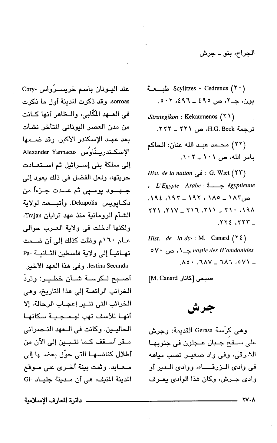 وهي كِرَسة Gerasa القديمة: وجرش على سفح جبال عجلون في جنوبها الشرقي، وفي واد صغير تصب مياهه في وادي الزرقاء، ووادي الدير أو وادي جرش، وكان هذا الوادي يعرف عند اليونان باسم خريسرواس - Ch sorroas . وقد ذكرت المدينة أول ما ذكرت في العهد المكّابى، والظاهر أنها كانت من مدن العصر اليونانى المتأخر نشأت بعد عهد الإسكندر الأكبر. وقد ضمها الإسكندرينَاوُس Alexander Yannaeus إلى مملكة بنى إسرائيل ثم استعادت حريتها، ولعل الفضل في ذلك يعود إلى جهود بومبي ثم عدت جزءًا من دكابويس Dekapolis . وأتبعت لولاية الشام الرومانية منذ عهد ترايان Trajan, ولكنها أدخلت في ولاية العرب حوالي عام 160 م وظلت كذلك إلى أن ضمت نهائيًا إلى ولاية فلسطين الثانية - Pa lestina Secunda . وفي هذا العهد الأخير أصبح لكرسة شأن خطير؛ وتردّ الخرائب الرائعة إلى هذا التاريخ، وهي الخرائب التي تثير إعجاب الرحالة، إلا أنها للأسف نهب لهمجية سكانها الحاليين. وكانت في العهد النصرانى مقر أسقف كما نتبين إلى الآن من أطلال كنائسها التي حوّل بعضها إلى معابد. وثمت بينة أخرى على موقع المدينة المنيف، هي أن مدينة جلياد Gi-