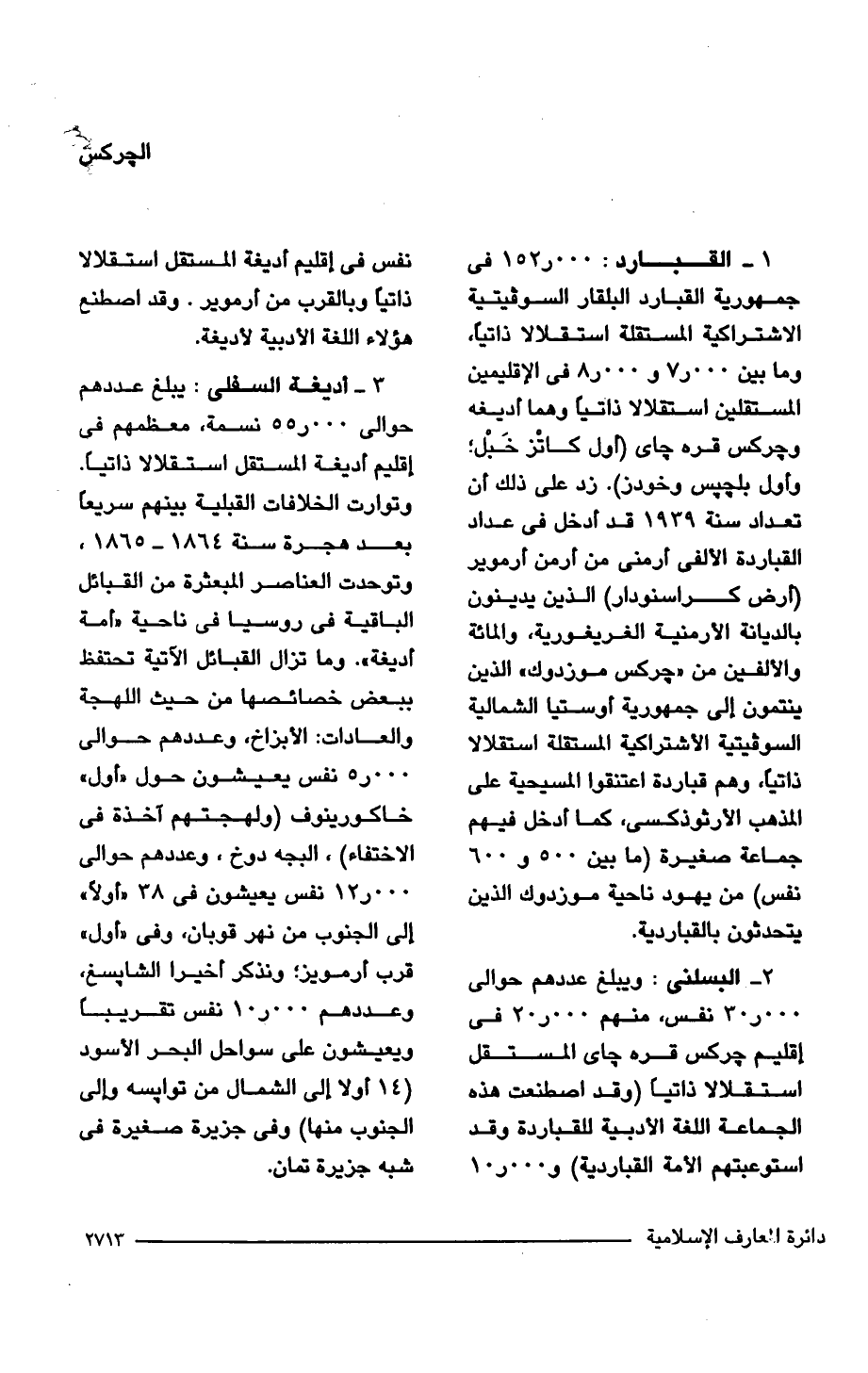 1 - القبارد: 125.000 في جمهورية القبارد البلقار السوفيتية الاشتراكية المستقلة استقلالا ذاتيًا، وما بين 7.000 و 8.000 في الأقليمين المستقلين استقلالا ذاتيا وهما أديغه وجركس قره جاى أول كاتْز خَبْل؛ وأول بلجيس وخودز). زد على ذلك أن تعداد سنة 1939 قد أدخل في عداد القباردة الألفى أرمنى من أرمن أرموير (أرض كراسنودار) الذين يدينون بالديانة الأرمنية الغريغورية، والمائة والألفين من "جركس موزدوك" الذين ينتمون إلى جمهورية أوستيا الشمالية السوفيتية الأشتراكية المستقلة استقلالا ذاتيًا، وهم قباردة اعتنقوا المسيحية على المذب الأرثوذكسى، كما أدخل فيهم جماعة صغيرة (ما بين 500 و 600 نفس) من يهود ناحية موزدوك الذين يتحدثون بالقباردية.