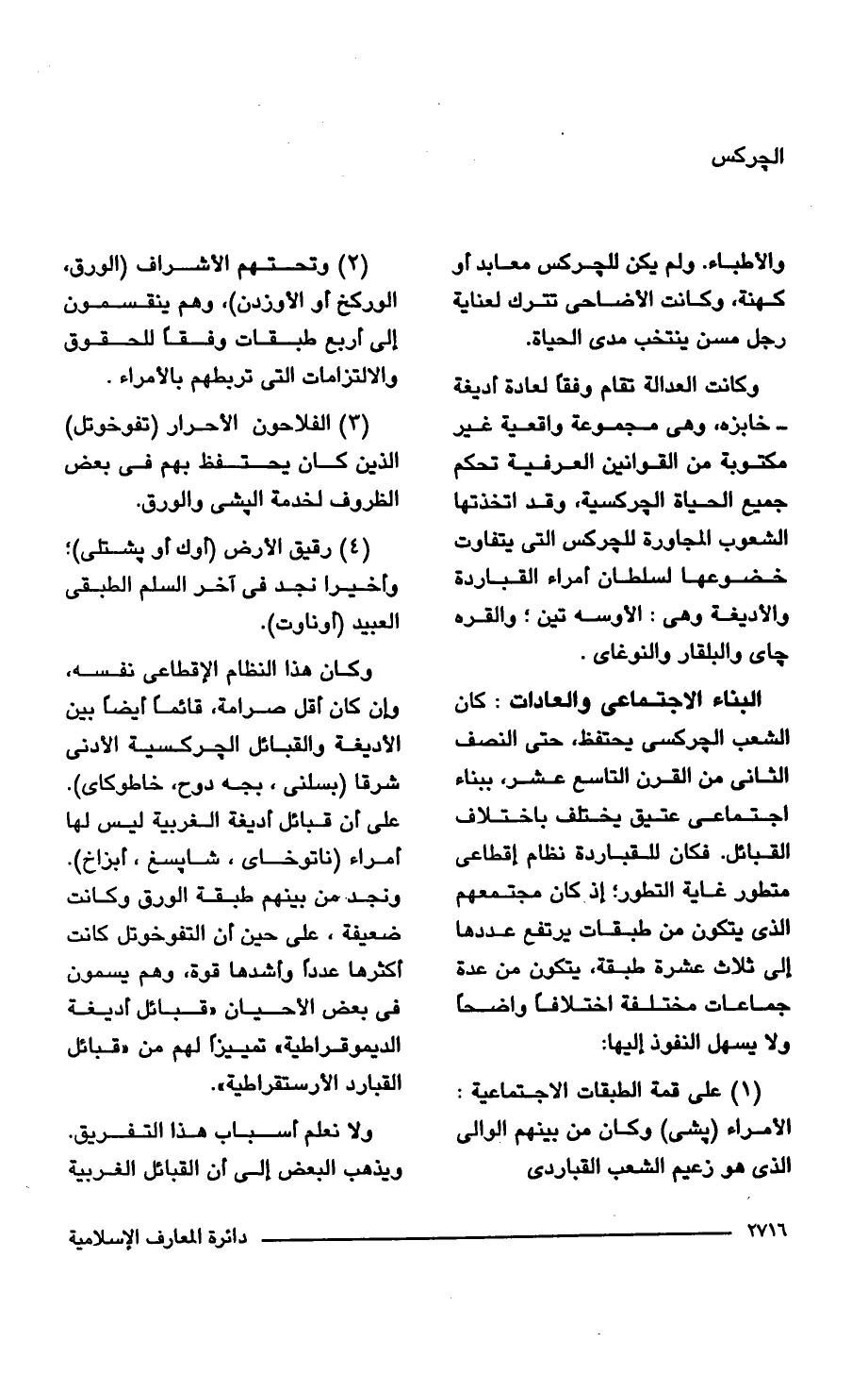 وكان هذا النظام الإقطاعى نفسه، وإن كان أقل صرامة، قائمًا أيضًا بين الأديغة والقبائل الجركسية الأدنى شرقا (بسلنى، بجه دوح، خاطوكاى). على أن قبائل أديغة الغربية ليس لها أمراء (ناتوخاى، شابسغ، أبزاخ). ونجد. عن بينهم طبقة الورق وكانت ضعيفة، على حين أن التفوخوتل كانت أكثرها عددًا وأشدها قوة، وهم يسمون في بعض الأحيان "قبائل أديغة الديموقراطية" تمييزًا لهم من "قبائل القبارد الأرستقراطية".