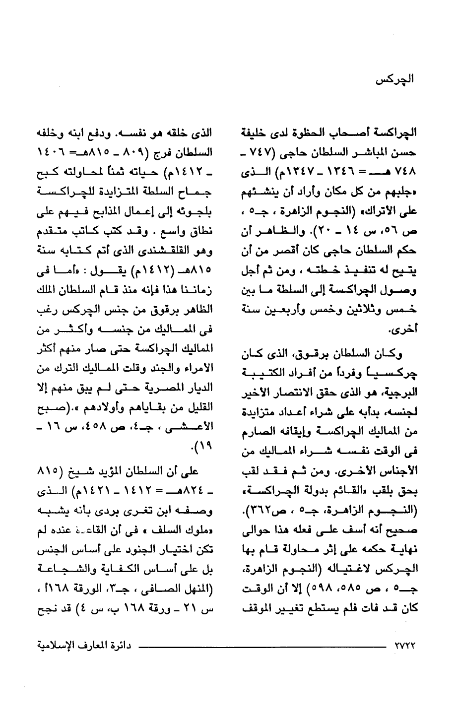وكان السلطان برقوق، الذي كان جركسيًا وفردًا من أفراد الكتيبة البرجية، هو الذي حقق الانتصار الأخير لجنسه، بدأبه على شراء أعداد متزايدة من المماليك الجراكسة وإيقافه الصارم في الوقت نفسه شراء المماليك من الأجناس الأخرى. ومن ثم فقد لقب بحق بلقب "القائم بدولة الجراكسة" (النجوم الزاهرة، جـ 5، ص 362). صحيح أنه أسف على فعله هذا حوالي نهاية حكمه على إثر محاولة قام بها الجركس لاغتياله (النجوم الزاهرة، جـ 5، ص 585، 598) إلا أن الوقت كان قد فات فلم يستطع تغيير الموقف الذي خلقه هو نفسه. ودفع ابنه وخلفه السلطان فرج (809 - 815 هـ = 1406 - 1412 م) حياته ثمنًا لمحاولته كبح جماح السلطة المتزايدة للجراكسة بلجوئه إلى إعمال المذابح فيهم على نطاق واسع. وقد كتب كاتب متقدم وهو القلقشندى الذي أتم كتابه سنة 815 هـ (1412 م) يقول: "أما في زماننا هذا فإنه منذ قام السلطان الملك الظاهر برقوق من جنس الجركس رغب في المماليك من جنسه وأكثر من المماليك الجراكسة حتى صار منهم أكثر الأمراء والجند وقلت المماليك الترك من الديار المصرية حتى لم يبق منهم إلا القليل من بقاياهم وأولادهم". (صبح الأعشى، جـ 4، ص 458، س 16 - 19).