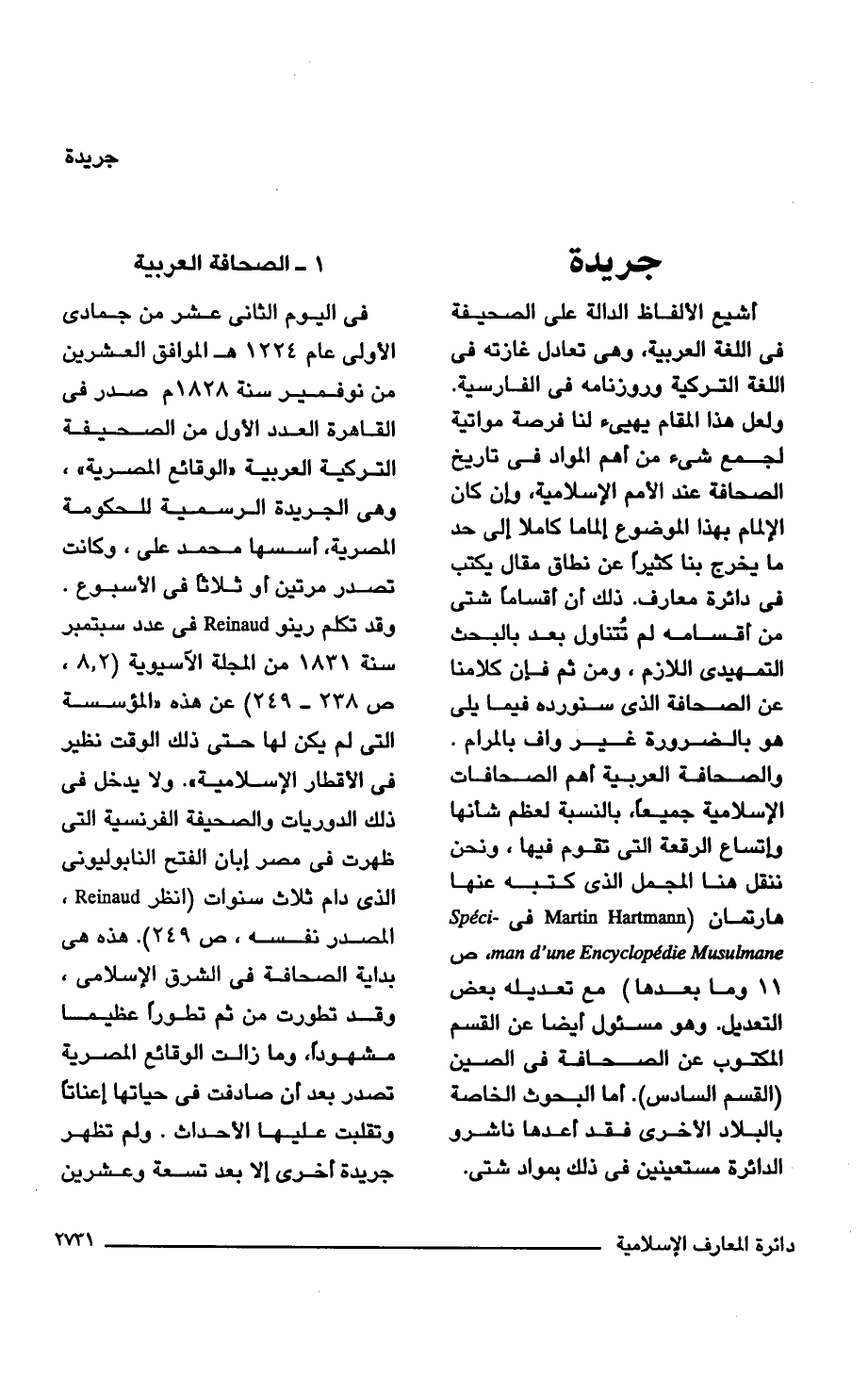 أشيع الألفاظ الدالة على الصحيفة في اللغة العربية، وهي تعادل غازته في اللغة التركية وروزنامه في الفارسية. ولعل هذا المقام يهيئ لنا فرصة مواتية لجمع شيء من أهم المواد في تاريخ الصحافة عند الأمم الإسلامية، وإن كان الإلمام بهذا الموضوع إلماما كاملًا إلى حد ما يخرج بنا كثيرًا عن نطاق مقال يكتب في دائرة معارف. ذلك أن أقسامًا شتى من أقسامه لم ئتناول بعد بالبحث التمهيدى اللازم، ومن ثم فإن كلامنا عن الصحافة الذي سنورده فيما يلي هو بالضرورة غير واف بالمرام. والصحافة العربية أهم الصحافات الإسلامية جميعًا، بالنسبة لعظم شأنها وإتساع الرقعة التي تقوم فيها، ونحن ننقل هنا المجمل الذي كتبه عنها هارتمان (Martin Hartmann في Speci- man d'une Encyclopedie Musulmane، ص، 11 وما بعدها) مع تعديله بعض التعديل. وهو مسئول أيضًا عن القسم المكتوب عن الصحافة في الصين (القسم السادس). أما البحوث الخاصة بالبلاد الأخرى فقد أعدها ناشرو الدائرة مستعينين في ذلك بمواد شتى.