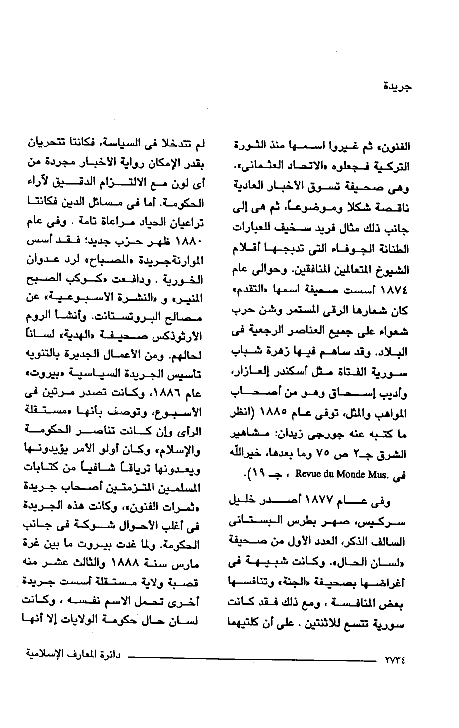 الفنون" ثم غيروا اسمها منذ الثورة التركية فجعلوه "الاتحاد العثمانى". وهي صحيفة تسوق الأخبار العادية ناقصة شكلا وموضوعًا، ثم هي إلى جانب ذلك مثال فريد سخيف للعبارات الطنانة الجوفاء التي تدبجها أقلام الشيوخ المتعالمين المنافقين. وحوالى عام 1874 أسست صحيفة اسمها "التقدم" كان شعارها الرقى المستمر وشن حرب شعواء على جميع العناصر الرجعية في البلاد. وقد ساهم فيها زهرة شباب سورية الفتاة معكل أسكندر إلعازار، وأديب إسحاق وهو من أصحاب المواهب والمثل، توفى عام 1885 (انظر ما كتبه عنه جورجى زيدان: مشاهير الشرق جـ 2 ص 75 وما بعدها، خير الله في. Revue du Monde Mus، جـ 19).