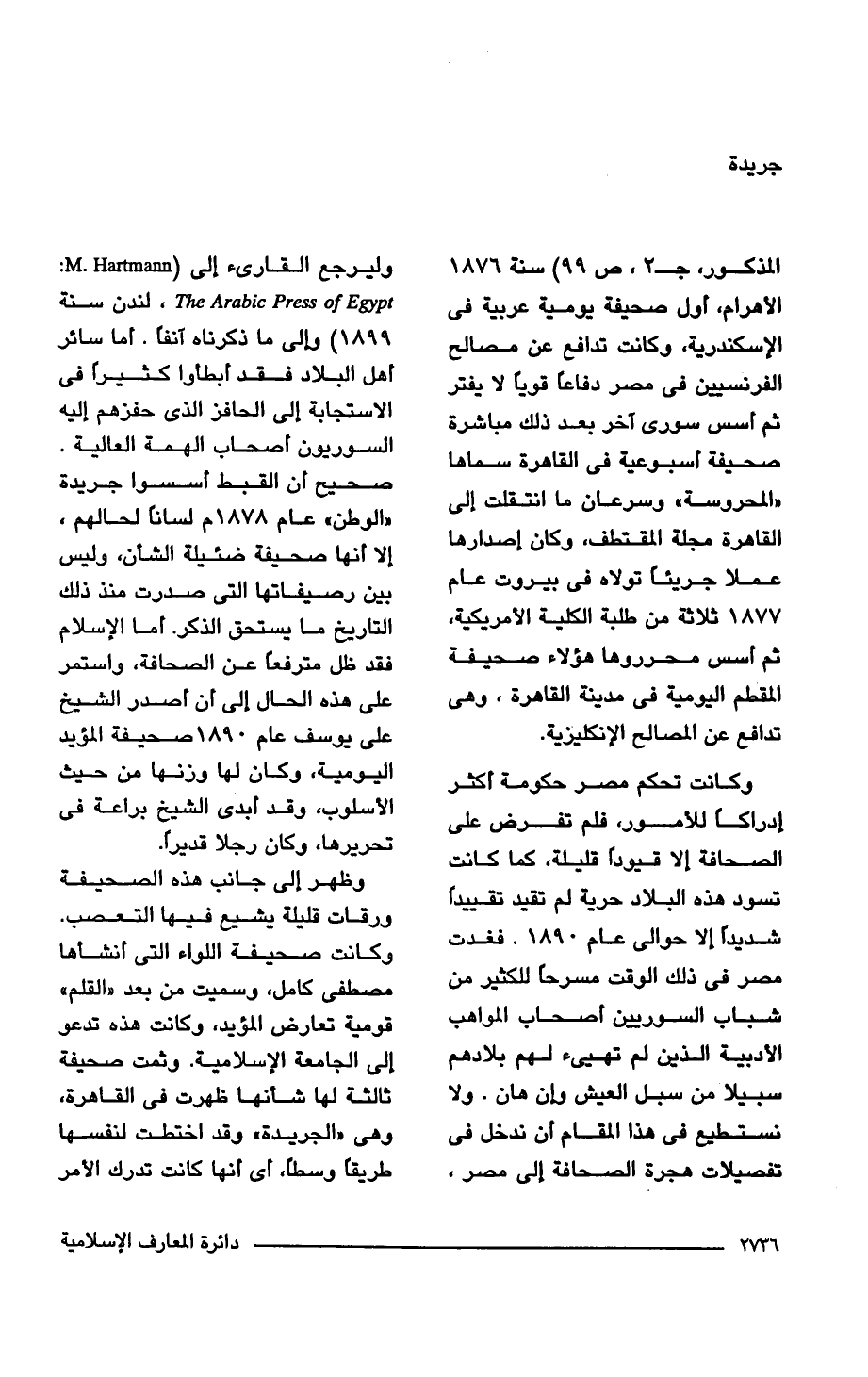 وكانت تحكم مصر حكومة أكئر إدراكًا للأمور، فلم تفرض على الصحافة إلا قيودًا قليلة، كما كانت تسود هذه البلاد حرية لم تقيد تقييدًا شديدًا إلا حوالي عام 1890. فغدت مصر في ذلك الوقت مسرحًا للكثير من شباب السوريين أصحاب المواهب الأدبية الذين لم تهيئ لهم بلادهم سبيلا من سبل العيش وإن هان. ولا نستطيع في هذا المقام أن ندخل في تفصيلات هجرة الصحافة إلى مصر، وليرجع القارئ إلى (: M. Hartmann The Arabic Press of gypt . لندن سنة 1899) وإلى ما ذكرنا , آنفًا. أما سائر أهل البلاد فقد أبطأوا كثيرًا في الاستجابة إلى الحافز الذي حفزهم إليه السوريون أصحاب الهمة العالية. صحيح أن القبط أسسوا جريدة "الوطن" عام 1878 م لسانًا لحالهم، إلا أنها صحيفة ضئيلة الشأن، وليس بين رصيفاتها التي صدرت منذ ذلك التاريخ ما يستحق الذكر. أما الإسلام فقد ظل مترفعًا عن الصحافة، واستمر على هذه الحال إلى أن أصدر الشيخ على يوسف عام 1890 صحيفة المؤيد اليومية، وكان لها وزنها من حيث الأسلوب، وقد أبدى الشيخ براعة في تحريرها، وكان رجلا قديرًا.