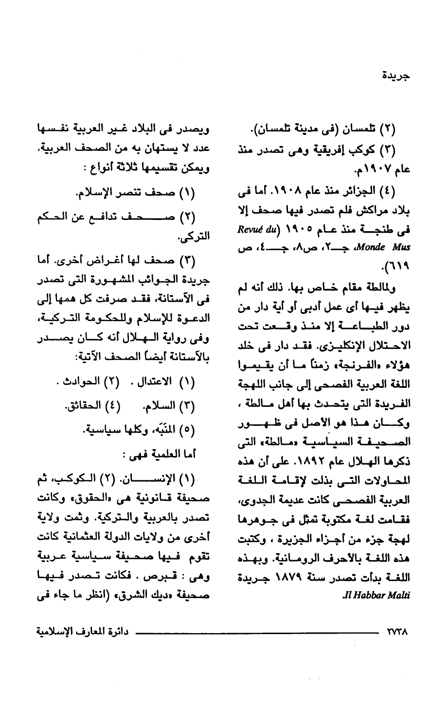 (4) الجزائر منذ عام 1908. أما في بلاد مراكش فلم تصدر فيها صحف إلا في طنجة منذ عام 1905 (Revue du Monde Mus، جـ 2، ص 8، جـ 4، ص 619).