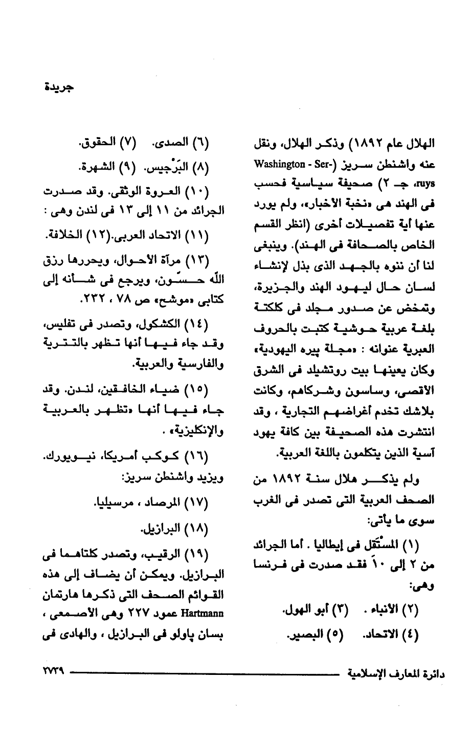 (19) الرقيب، وتصدر كلتاهما في البرازيل. ويمكن أن يضاف إلى هذه القوائم الصحف التي ذكرها هارتمان Hartmann عمود 227 وهي الأصمعى، بسان باولو في البرازيل، والهادي في