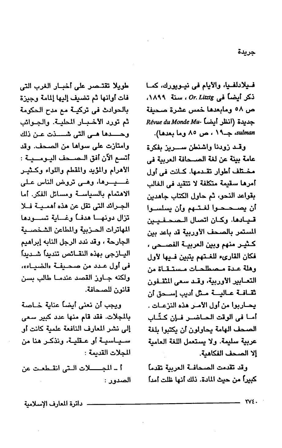 ويجب أن نعنى أيضًا عناية خاصة بالمجلات. فقد قام منها عدد كبير سعى إلى نشر المعارف النافعة علمية كانت أو سياسية أو عقلية، ونذكر هنا من المجلات القديمة: