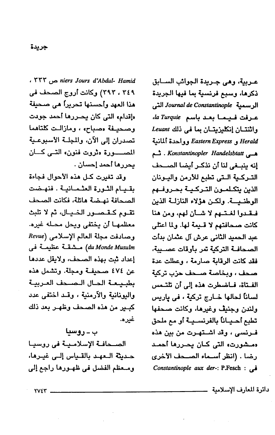 عربية، وهي جريدة الجوائب السابق ذكرها، وسبع فرنسية بما فيها الجريدة الرسمية Journal de Constantinople التي عرفت فيما بعد باسم Turquie la، واثنتان إنكليزيتان بما في ذلك، Leuant Eastern Express j Herald وواحدة ألمانية هي Konstantinopler Handelsbtatt. ثم أنه ينبغي لنا أن نذكر أيضًا الصحف التركية التي تطبع للأرمن واليونان الذين يتكلمون التركية بحروفهم الوطنية. ولكن هؤلاء النازلة الذين فقدوا لغتهم لا شأن لهم، ومن هنا كانت صحافتهم لا قيمة لها. ولما اعتلى عبد الحميد الثاني عرش آل عثمان بدأت الصحافة التركية تمر بأوقات عصيبة، فقد كانت الرقابة صارمة، وعطلت عدة صحف، وبخاصة صحف حزب تركية الفتاة، فاضطرت هذه إلى أن تلتمس لسانًا لحالها خارج تركية، في باريس ولندن وجنيف وغيرها، وكانت صحفها تطبع أحيانًا بالفرنسية أو مع ملحق فرنسى، وقد اشتهرت من بين هذه "مشورت" التي كان يحررها أحمد رضا. (انظر أسماء الصحف الأخرى في: Constantinople aux der-: p .Fesch niers Jours d'Abdul- Hamid ص 333. 349، 393) كانت أروج الصحف في هذا العهد وأحسنها تحريرًا هي صحيفة "إقدام"التي كان يحررها أحمد جودت وصحيفة "صباح"، وما زالت كلتاهما تصدران إلى الآن، والمجلة الأسبوعية المصورة "ثروت فنون" التي كان يحررها أحمد إحسان.