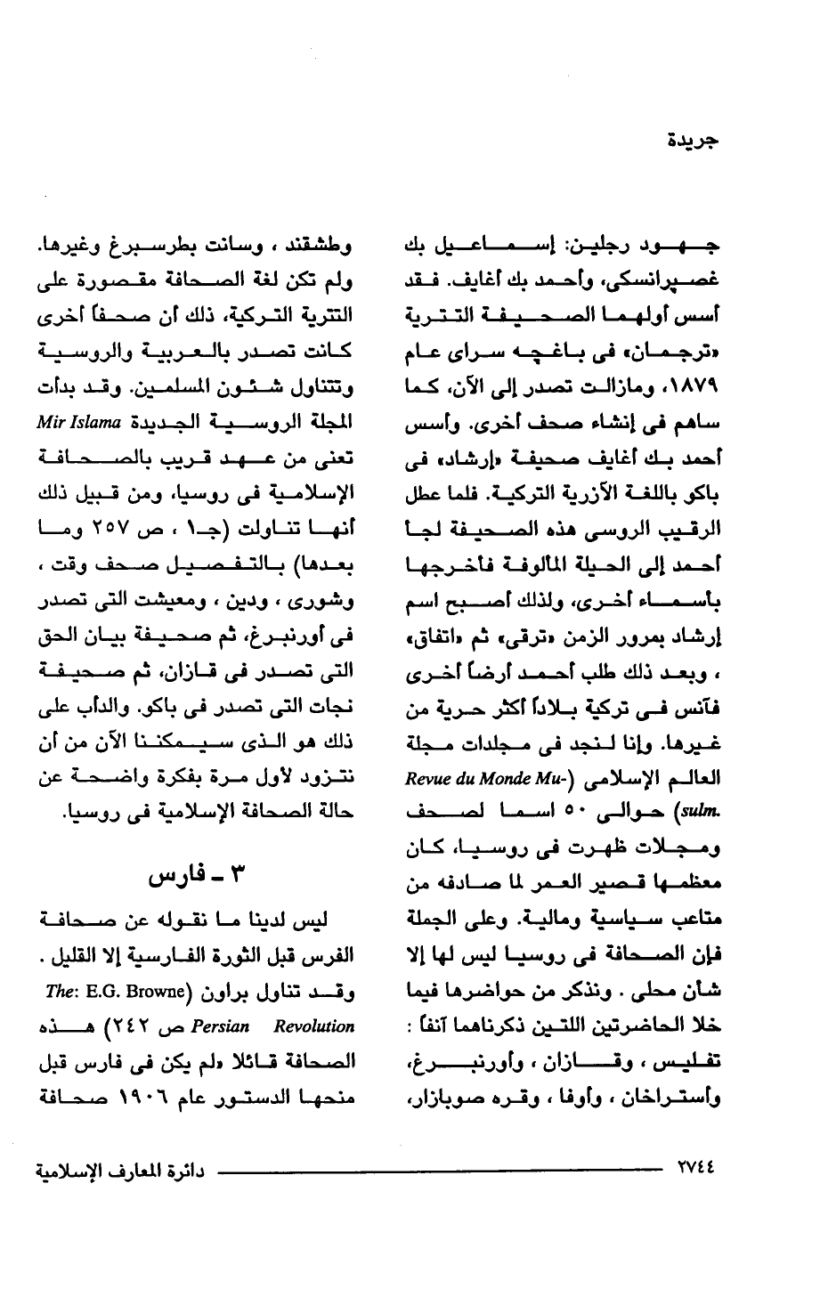 جهود رجلين: إسماعيل بك غصيرانسكى، وأحمد بك أغايف. فقد أسس أولهما الصحيفة التترية "ترجمان" في باغجه سراى عا 1879، وما زالت تصدر إلى الآن، كما ساهم في إنشاء صحف أخرى. وأسس أحمد بك أغايف صحيفة "إرشاد" في باكو باللغة الأزرية التركية. فلما عطل الرقيب الروسى هذه الصحيفة لجأ أحمد إلى الحيلة المألوفة فأخرجها بأسماء أخرى، ولذلك أصبح اسم إرشاد بمرور الزمن "ترقى" ثم "اتفاق"، وبعد ذلك طلب أحمد أرضًا أخرى فآنس في تركية بلادًا أكثر حرية من غيرها. وإنا لنجد في مجلدات مجلة العالم الإسلامي (Mu- Revue du Monde sulm-) حوالي 50 اسما لصحف ومجلات ظهرت في روسيا، كان معظمها قصير العمر لما صادفه من متاعب سياسية ومالية. وعلى الجملة فإن الصحافة في روسيا ليس لها إلا شأن على. ونذكر من حواضرها فيما خلا الحاضرتين اللتين ذكرناهما آنفًا: تفليس، وقازان، وأورنبرغ، وأستراخان، وأوفا، وقره صوبازار، وطشقند، وسانت بطرسبرغ وغيرها. ولم تكن لغة الصحافة مقصورة على التترية التركية، ذلك أن صحفًا أخرى كانت تصدر بالعربية والروسية وتتناول شئون المسلمين. وقد بدأت المجلة الروسية الجديدة Mir Islamn تعنى من عهد قريب بالصحافة الإسلامية في روسيا، ومن قبيل ذلك أنها تناولت (جـ 1، ص 257 وما بعدها) بالتفصيل صحف وقت، وشورى، ودين، ومعيشت التي تصدر في أورنبرغ، ثم صحيفة بيان الحق التي تصدر في قازان، ثم صحيفة نجات التي تصدر في باكو. والدأب على ذلك هو الذي سيمكننا الآن من أن نتزود لأول مرة بفكرة واضحة عن حالة الصحافة الإسلامية في روسيا.