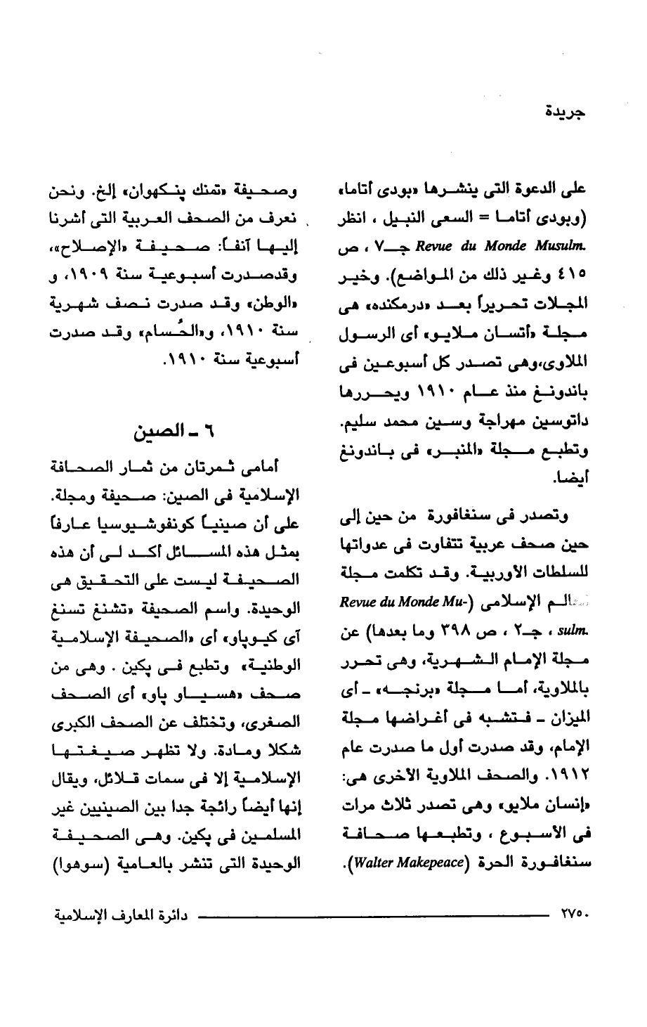وتصدر في سنغافورة من حين إلى حين صحف عربية تتفاوت في عدواتها للسلطات الأوربية. وقد تكلمت مجلة العالم الإسلامي (Mu- Revue du Monde sulm-، جـ 2، ص 398 وما بعدها) عن مجلة الإمام الشهرية، وهي تحرر بالملاوية، أما مجلة "برنجه" -أي الميزان- فتشبه في أغراضها مجلة الإمام، وقد صدرت أول ما صدرت عام 1912. والصحف الملاوية الأخرى هي: "إنسان ملايو" وهي تصدر ثلاث مرات في الأسبوع، وتطبعها صحافة سنغافورة الحرة (Walter Makepeace) . وصحيفهَ "تمنك بنكهوان" الخ. ونحن نعرف من الصحف العربية التي أشرنا إليها آنفًا: صحيفة "الإصلاح"، وقد صدرت أسبوعية سنة "الوطن" وقد صدرت نصف شهرية سنة 1910، و"الحُسام" وقد صدرت أسبوعية سنة 1910.