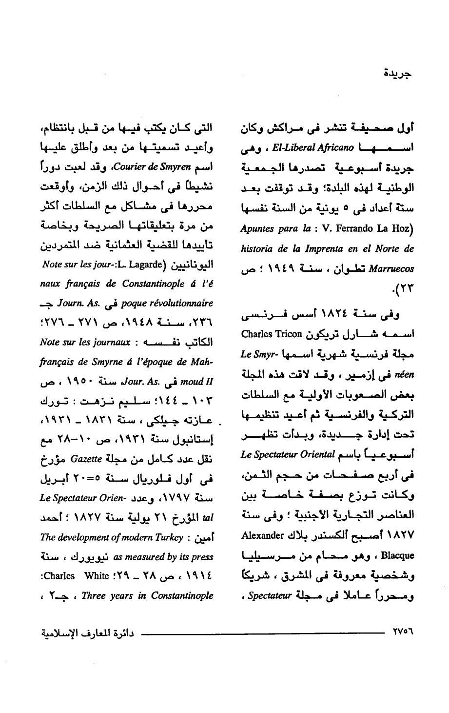 وفي سنة 1824 أسس فرنسى اسمه شارل تريكون Charles Tricon مجلة فرنسية شهرية اسمها - Le Smyr neen في إزمير، وقد لاقت هذه المجلة بعض الصعوبات الأولية مع السلطات التركية والفرنسية ثم أعيد تنظيمها تحت إدارة جديدة، وبدأت تظهر أسبوعيًا باسم Le Spectateur Oriental في أربع صفحات من حجم الثمن، وكانت توزع بصفة خاصة بين العناصر التجارية الأجنبية؛ وفي سنة 1827 أصبح ألكسندر بلاك Alexander Blacque . وهو محام من مرسيليا وشخصية معروفة في المشرقء شريكا ومحررًا عاملا في مجلة Spectateur، التي كان يكتب فيها من قبل بانتظام، وأعيد تسميتها من بعد وأطلق عليها اسم Courier de Smyren. وقد لعبت دورًا نشيطًا في أحوال ذلك الزمن، وأوقعت محررها في مشاكل مع السلطات أكثر من مرة بتعليقاتها الصريحة وبخاصة تأييدها للقضية العثمانية ضد المتمردين اليونانيين (Note sur les jour-: L. Lagarde naux francais de Constantinople a d l'e Poque revolutionnaire في Journ, As- جـ 236، سنة 1948، ص 271 - 276: الكاتب نفسه: Note sur les journaux -francais de Smyrne d l'epoque de Mah Jour. As- Moud II سنة 1950، ص 103 - 104؛ سليم نزهت: تورك عازته جيلكى، سنة 1831 - 1931، إستانبول سنة 1931، ص 10 - 28 مع نقل عدد كامل من مجلة Gazette مؤرخ في أول فلوريال سنة 5 = 20 أبريل سنة 1797، وعدد Le Spectateur Orien- tal المؤرخ 21 بولية سنة 1827، أحمد أمين: The development of modern Turky as measured by its press نيويورك، سنة 1914، ص- 29؛ Charles White: Three years in Constantinople، جـ 2،