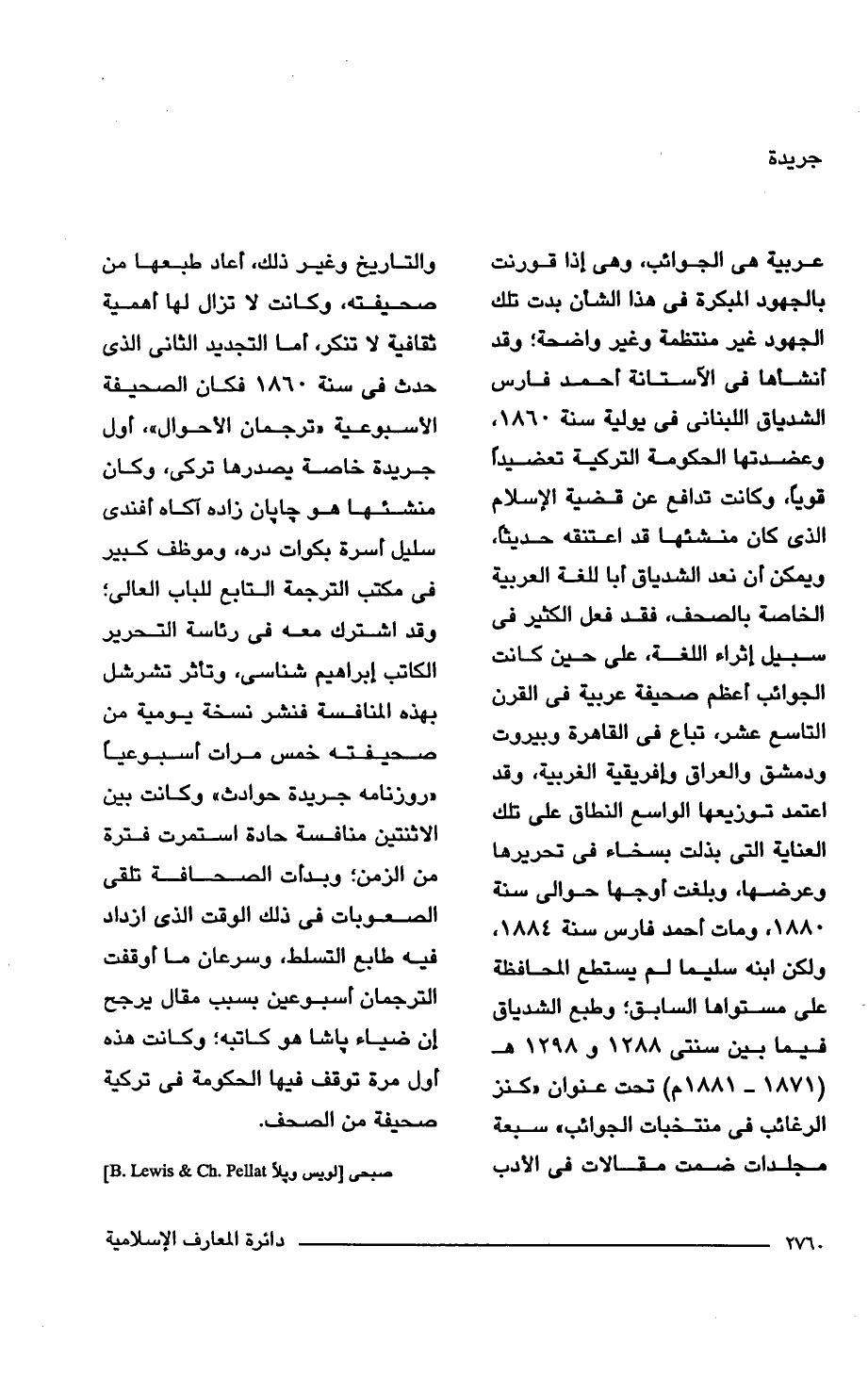 عربية هي الجوائب، وهي إذا قورنت بالجهود المبكرة في هذا الشأن بدت تلك الجهود غير منتظمة وغير واضحة؛ وقد أنشأها في الآستانة أحمد فارس الشدياق اللبنانى في يولية سنة 1860، وعضدتها الحكومة التركية تعضيدًا قويًّا، وكانت تدافع عن قضية الإسلام الذي كان منشئها قد اعتنقه حديثًا، ويمكن أن نعد الشدياق أبا للغة العربية الخاصة بالصحف، فقد فعل الكثير في سبيل إثراء اللغة، على حين كانت الجوائب أعظم صحيفة عربية في القرن التاسع عشر، تباع في القاهرة وبيروت ودمشق والعراق وإفريقية الغربية، وقد اعتمد توزيعها الواسع النطاق على تلك العناية التي بذلت بسخاء في تحريرها وعرضها، وبلغت أوجها حوالي سنة 1880، ومات أحمد فارس سنة 1884، ولكن ابنه سليما لم يستطع المحافظة على مستواها السابق وطبع الشدياق فيما بين سنتى 1288 و 1298 هـ (1871 - 1881 م) تحت عنوان "كنز الرغائب في منتخبات الجوائب" سبعة مجلدات ضمت مقالات في الأدب والتاريخ وغير ذلك، أعاد طبعها من صحيفته، وكانت لا تزال لها أهمية ثقافية لا تنكر، أما التجديد الثاني الذي حدث في سنة 1860 فكان الصحيفة الأسبوعية "ترجمان الأحوال"، أول جريدة خاصة يصدرها تركى، وكان منشئها هو جابان زاده آكاه أفندى سليل أسرة بكوات دره، وموظف كبير في مكتب الترجمة التابع للباب العالى؛ وقد اشترك معه في رئاسة التحرير الكاتب إبراهيم شناسى، وتأثر تشرشل بهذه المنافسة فنشر نسخة يومية من صحيفته خمس مرات أسبوعيًا "روزنامه جريدة حوادث" وكانت بين الاثنتين منافسة حادة استمرت فترة من الزمن؛ وبدأت الصحافة تلقى الصعوبات في ذلك الوقت الذي ازداد فيه طابع التسلط، وسرعان ما أوقفت الترجمان أسبوعين بسبب مقال يرجح إن ضياء باشا هو كاتبه؛ وكانت هذه أول مرة توقف فيها الحكومة في تركية صحيفة من الصحف.