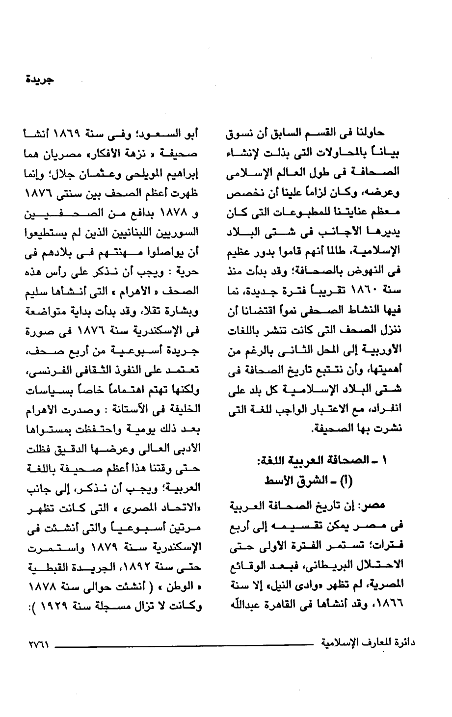 مصر: إن تاريخ الصحافة العربية في مصر يمكن تقسيمه إلى أربع فترات؛ تستمر الفترة الأولى حتى الاحتلال البريطانى، فبعد الوقائع المصرية، لم تظهر "وادي النيل" إلا سنة 1866، وقد أنشاها في القاهرة عبد الله أبوالسعود؛ وفي سنة 1869 أنشأ صحيفة "نزهة الأفكار" مصريان هما إبراهيم المويلحى وعثمان جلال؛ وإنما ظهرت أعظم الصحف بين سنتى 1876 و 1878 بدافع من الصحفيين السوريين اللبنانيين الذين لم يستطيعوا أن يواصلوا مهنتهم في بلادهم في حرية: ويجب أن نذكر على رأس هذه الصحف "الأهرام" التي أنشأها سليم وبشارة تقلا، وقد بدأت بداية متواضعة في الإسكندرية سنة 1876 في صورة جريدة أسبوعية من أربع صحف، تعتمد على النفوذ الثقافى الفرنسى، ولكنها تهتم اهتمامًا خاصًّا بسياسات الخليفة في الآستانة: وصدرت الأهرام بعد ذلك يومية واحتفظت بمستواها الأدبى العالى وعرضها الدقيق فظلت حتى وقتنا هذا أعظم صحيفة باللغة العربية؛ ويجب أن نذكر، إلى جانب "الاتحاد المصري" التي كانت تظهر مرتين أسبوعيًا والتي أنشئت في الإسكندرية سنة 1892 واستمرت حتى سنة 1892, الجريدة القبطية "الوطن" (أنشئت حوالي سنة 1878 وكانت لا تزال مسجلة سنة 1929):