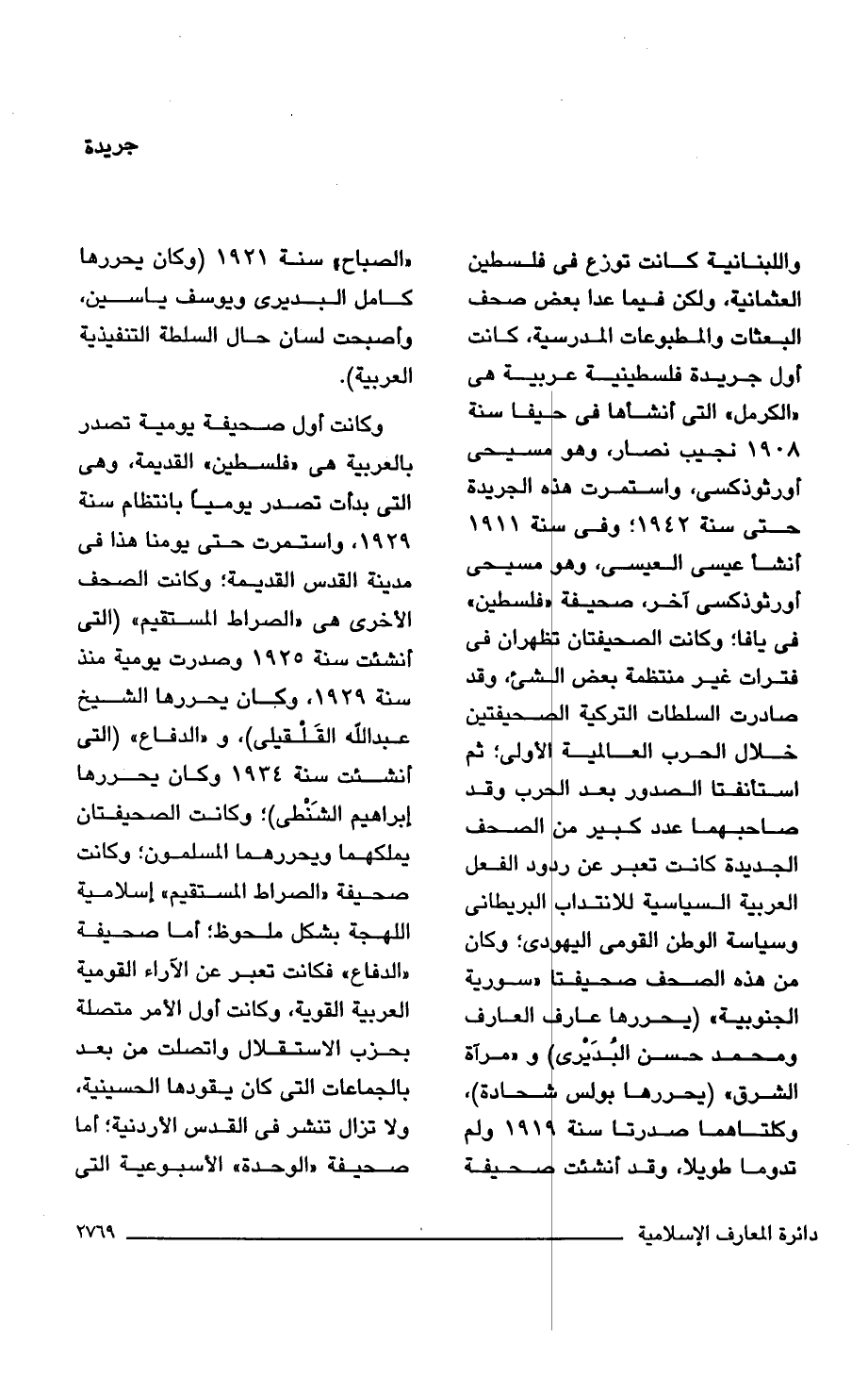 وكانت أول صحيفة يومية تصدر بالعربية هي "فلسطين" القديمة، وهي التي بدأت تصدر يوميا بانتظام سنة 1929. واستمرت حتى يومنا هذا في مدينة القدس القديمة؛ وكانت الصحف الأخرى هي "الصراط المستقيم" (التي أنشئت سنة 1925 وصدرت يومية منذ سنة 1929، وكان يحررها الشيخ عبد الله القَلْقيلى)، و "الدفاع" (التي أنشئت سنة 1934 وكان يحررها إبراهيم الشَنْطى)؛ وكانت الصحيفتان يملكهما ويحررهما المسلمون؛ وكانت صحيفة "الصراط المستقيم" إسلامية اللهجة بشكل ملحوظ؛ أما صحيفة "الدفاع" فكانت تعبر عن الآراء القومية العربية القوية، وكانت أول الأمر متصلة بحزب الاستقلال واتصلت من بعد بالجماعات التي كان يقودها الحسينية، ولا تزال تنشر في القدس الأردنية؛ أما صحيفة "الموحدة" الأسبوعية التي