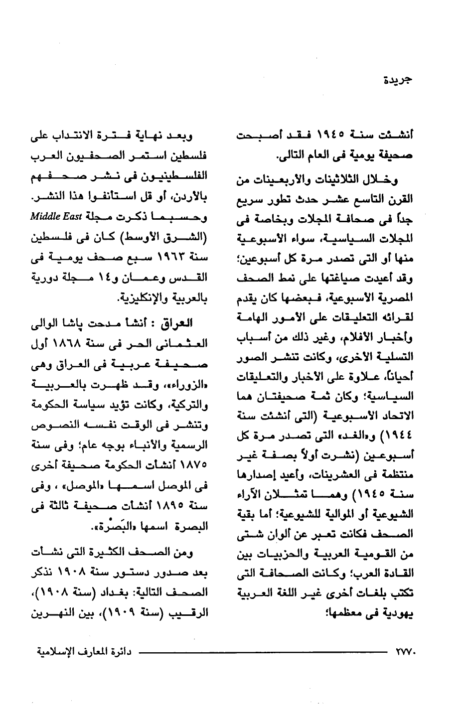 العراق: أنشأ مدحت باشا الوالى العثمانى الحر في سنة 1868 أول صحيفة عربية في العراق وهي "الزوراء"، وقد ظهرت بالعربية والتركية، وكانت تؤيد سياسة الحكومة وتنشر في الوقت نفسه النصوص الرسمية والأنباء بوجه عام؛ وفي سنة 1875 أنشأت الحكومة صحيفة أخرى في الموصل اسمها "الموصل"، وفي سنة 1895 أنشأت صحيفة ثالثة في البصرة اسمها "البَصْرة".