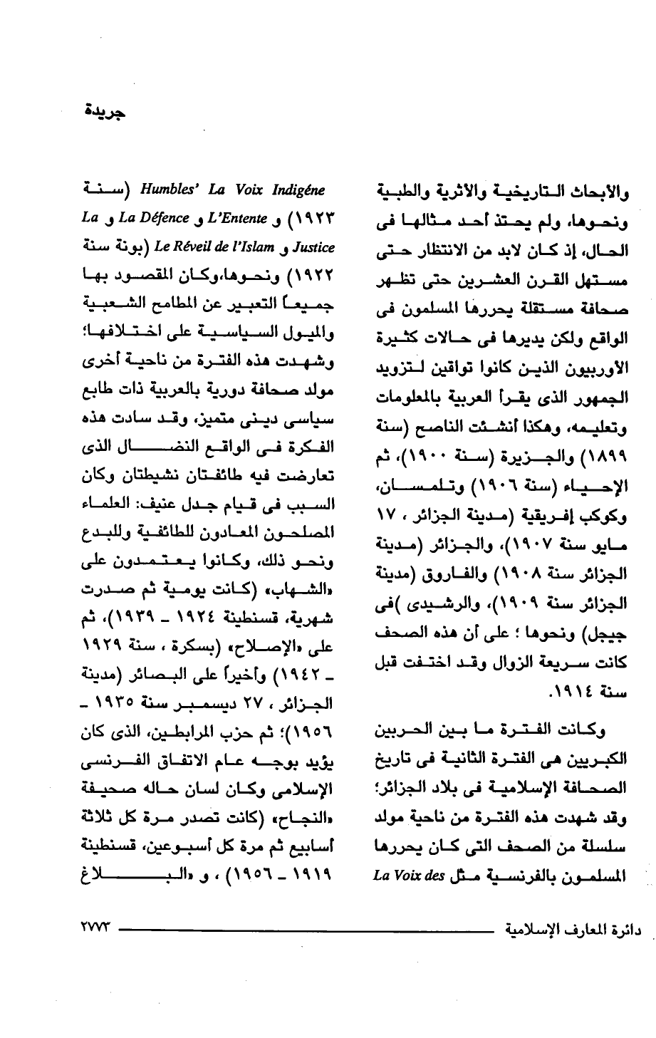 والأبحاث التاريخية والأثرية والطبية ونحوها، ولم يحتذ أحد مثالها في الحال، إذ كان لا بد من الانتظار حتى مستهل القرن العشرين حتى تظهر صحافة مستقلة يحررها المسلمون في الواقع ولكن يديرها في حالات كثيرة الأوربيون الذين كانوا تواقين لتزويد الجمهور الذي يقرا العربية بالمعلومات وتعليمه، وهكذا أنشئت الناصح (سنة 1899) والجزير ة (سنة 1900)، ثم الإحياء (سنة 1906) وتلمسان، وكوكب إفريقية (مدينة الجزائر، 17 مايو سنة 1907)، والجزائر (مدينة الجزائر سنة 1908) والفاروق (مدينة الجزائر سنة 1909). والرشيدى) في جيجل) ونحوها؛ على أن هذه الصحف كانت سريعة الزوال وقد اختفت قبل سنة 1914.