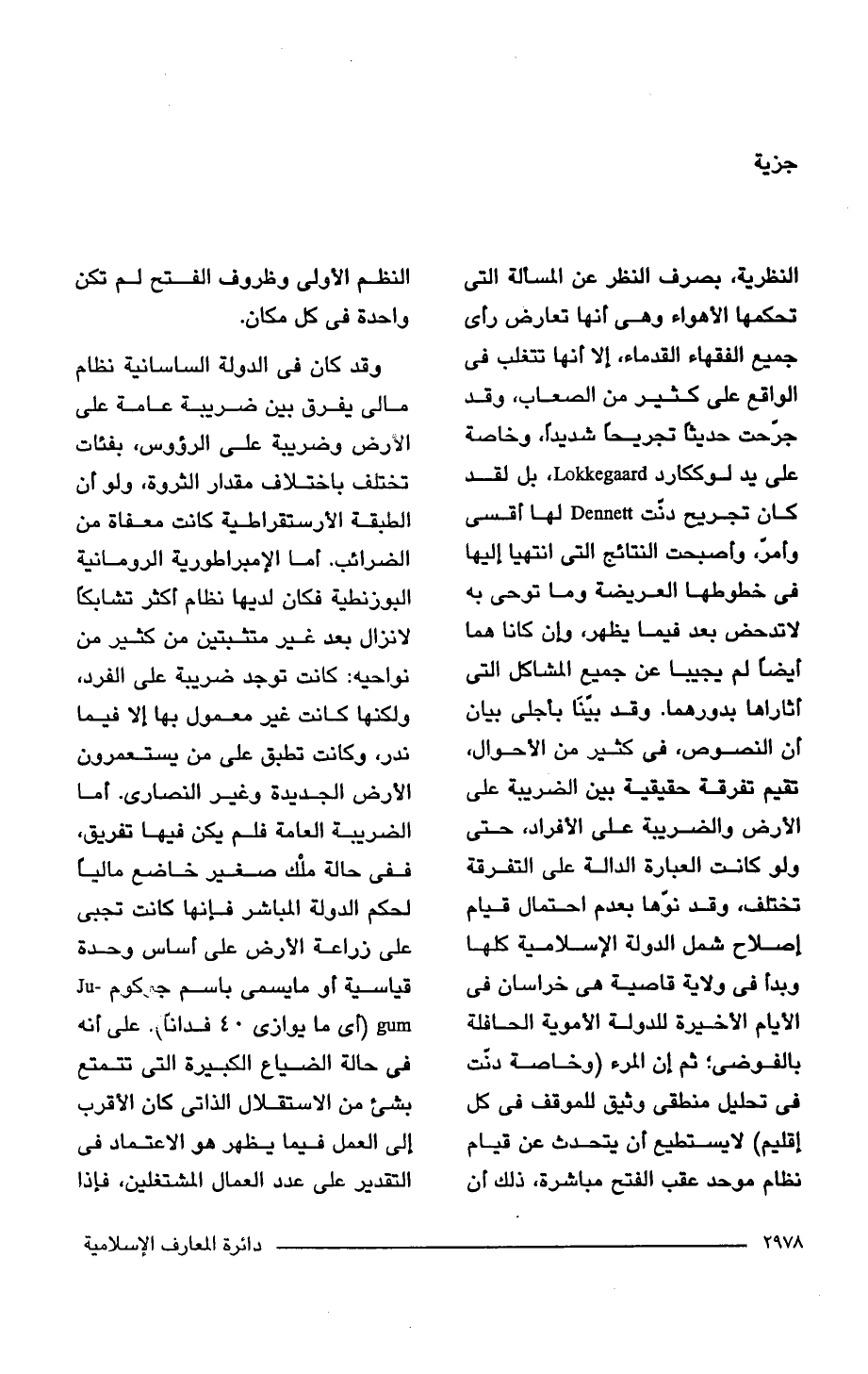 النظرية، بصرف النظر عن المسألة التي تحكمها الأهواء وهي أنها تعارض رأى جميع الفقهاء القدماء، إلا أنها تتغلب في الواقع على كثير من الصعاب، وقد جرحت حديثًا تجريحًا شديدًا، وخاصة على يد لوككارد Lokkegaard، بل لقد كان تجريح دنت Dennett لها اقسى وأمرّ، وأصبحت النتائج التي انتهيا إليها في خطوطها العريضة وما توحى به لاتدحض بعد فيما يظهر، وإن كانا هما أيضًا لم يجيبا عن جميع المشاكل التي أثاراها بدورهما. وقد بيّنًا بأجلى بيان أن النصوص، في كثير من الأحوال، تقيم تفرقة حقيقية بين الضريبة على الأرض والضريبة على الأفراد، حتى ولوكانت العبارة الدالة على التفرقة تختلف، وقد نوّها بعدم احتمال قيام إصلاح شمل الدولة الإسلامية كلها وبدأ في ولاية قاصية هي خراسان في الأيام الأخيرة للدولة الأموية الحافلة بالفوضى؛ ثم إن المرء (وخاصة دنت في تحليل منطقى وثيق للموقف في كل إقليم) لا يستطيع أن يتحدث عن قيام نظام موحد عقب الفتح مباشرة، ذلك أن النظم الأولى وظروف الفتح لم تكن واحدة في كل مكان.