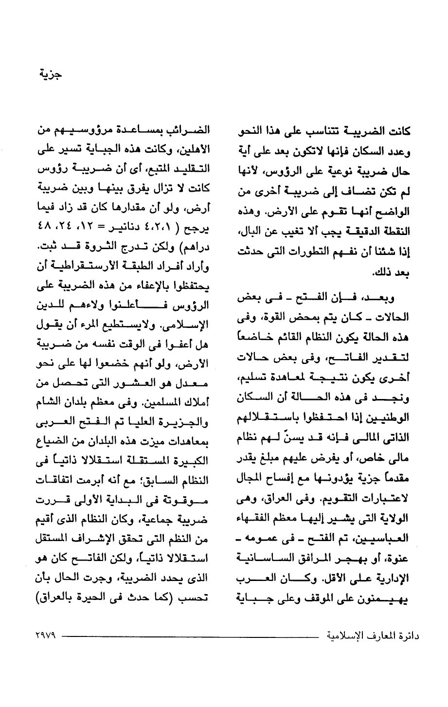 كانت الضريبة تتناسب على هذا النحو وعدد السكان فإنها لاتكون بعد على آية حال ضريبة نوعية على الرؤوس، لأنها لم تكن تضاف إلى ضريبة أخرى من الواضح أنها تقوم على الأرض. وهذه النقطة الدقيقة يجب ألا تغيب عن البال، إذا شئنا أن نفهم التطورات التي حدثت بعد ذلك.