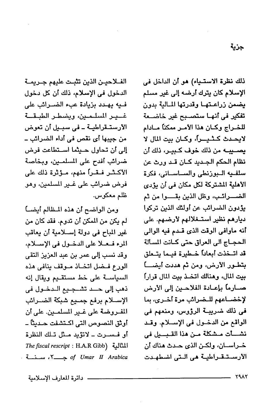 ومن الواضح أن هذه المظالم أيضًا لم يكن من الممكن أن تدوم. فقد كان من غير المباح في دولة اسلامية أن يعاقب المرء فعلا على الدخول في الإسلام , وقد نسب إلى عمر بن عبد العزيز التقى الورع فضل اتخاذ موقف ينافى هذه السياسة على خط مستقيم ويقال إنه ذهب إلى حد تشجيع الدخول في الإسلام برفع جميع شبكة الضرأئب المفروضة على غير المسلمين. على أن أوثق النصوص التي اكتشفت حديثًا - أو فسرت- لاتؤيد مثل تلك النظرة المثالية (rescript: H.A.R Gibb في The {fiscal of Umar II Arabica جـ 2، سنة.