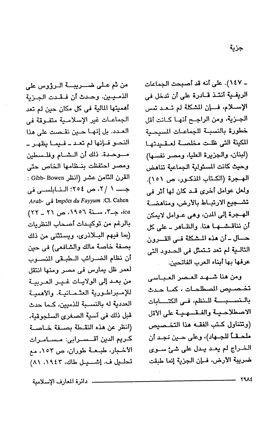 -147). على أنه قد أصبحت الجماعات الريفية آنئذ قادرة على أن تدخل في الإسلام، فإن المشكلة لم تعد تمس الجزية، ومن الراجح أنها كانت أقل خطورة بالنسبة للجماعات المسيحية المكينة التي ظلت مخلصة لعقيدتها (لبنان، والجزيرة العليا، ومصر نفسها) وحيث كانت المسئولية الجماعية تناهض الهجرة (الكتاب المذكور، ص 151). ولعل عوامل أخرى قد كان لها أثر في تشجيع الارتباط بالأرض، ومناهضة الهجرة إلى المدن، وهي عوامل لايمكن أن نناقشها هنا. والظاهر- على كل حال- أن هذه المشكلة في القرون التالية لم تعد تتمثل في الحدود التي عرفها بها أبناء العرب الفاتحين.