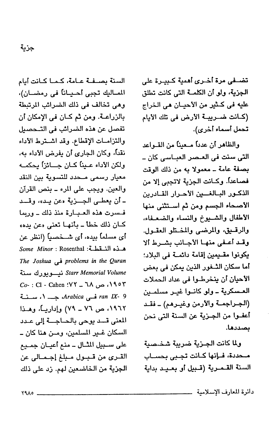 ولما كانت الجزية ضريبة شخصية محددة، فإنها كانت تجبى بحساب السنة القمرية (قبيل أو بعيد بداية السنة بصفة عامة، كما كانت أيام المماليك تجبى أحيانا في رمضان)، وهي تخالف في ذلك الضرائب المرتبطة بالزراعة. ومن ثم كان في الإمكان أن تفصل عن هذه الضرائب في التحصيل والتزامات الإقطاع. وقد اشترط الأداء نقدا، وكان الجارى أن يفرض الأداء به، ولكن الأداء عينا كان جائزا يحكمه معيار رسمي محدد للتسوية بين النقد والعين. ويجب على المرء- بنص القرآن - أن يعطى الجزية "عن يد"، وقد فسرت هذه العبارة منذ ذلك- وربما كان ذلك خطأ- بأنها تعنى "عن يده" أي مسلمًا بيده، أي شخصيا (انظر عن هذه النقطة: Some Minor: Rosenthal problems in the Quran في Starr Memorial Volume نيويورك سنة 1953, ص 68 - 72, co-: cl- cahen 9 - ran IX في Arabia جـ 1، سنة 1962 ص 76 - 79) وإداريًا، وهذا المعنى قد يوحى بالحاجة إلى عدد السكان غير المسلمين، ومن هنا كان- على سبيل المثال- منع أعيان جميع القرى من قبول مبلغ إجمالى عن الجزية من الخاضعين لهم. زد على ذلك