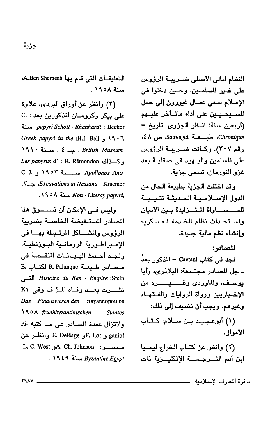 وليس في الإمكان أن نسوق هنا المصادر المستفيضة الخاصة بضريبة الرؤوس والمشاكل المرتبطة بها في الإمبراطورية الرومانية البوزنطية. ونجد أحدث البيانات المنقحة في مصادر طبعة R. Palanque لكتاب. Histoire du Bas - Empire: Stein التي نشرت بعد وفاة المؤاف وفي - Ka Das Finarizwesen des: rayannopoulos N `1 o A fruehbyzantinischen Staates 1958 ولا تزال عمدة المصادر هي ما كتبه - Pi ganiol و E. Deleage و F . Lot وانظر عن مصر: L. C. West A. Ch. Johnson: Byzantine Egypt سنة 1949.