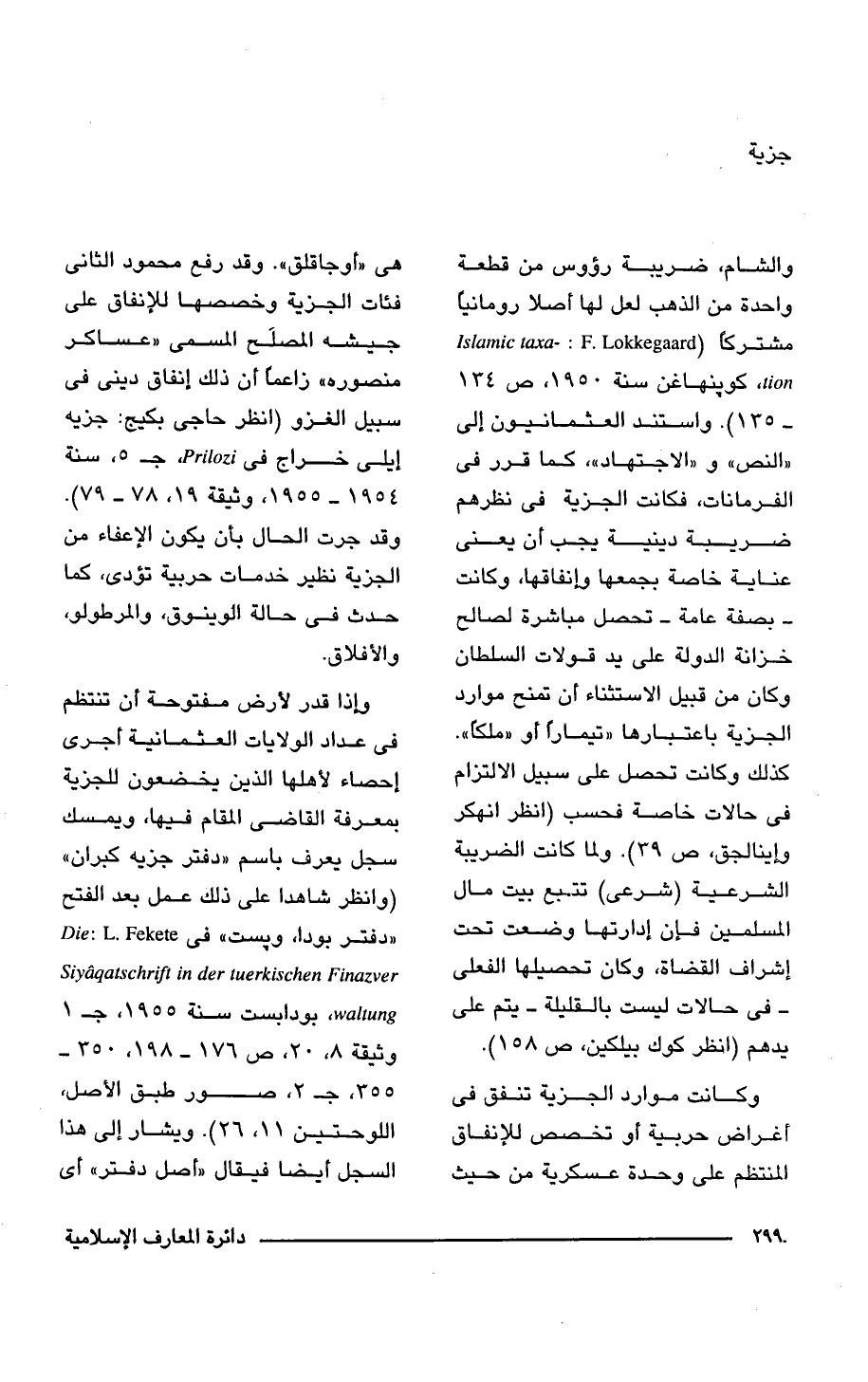 والشام، ضريبة رؤوس من قطعة واحدة من الذهب لعل لها أصلا رومانيًا مشتركًا (Islamic laxa-: F. Lokkegaard tion, كوبنهاغن سنة 1950، ص 134 - 135). واستند العثمانيون إلى "النص" و "الاجتهاد", كما قرر في الفرمانات، فكانت الجزية في نظرهم ضريبة دينية يجب أن يعني عناية خاصة بجمعها وإنفاقها، وكانت -بصفة عامة- تحصل مباشرة لصالح خزانة الدولة على يد قولات السلطان وكان من قبيل الاستثناء أن تمنح موارد الجزية باعتبارها "تيمارًا أو "ملكًا". كذلك وكانت تحصل على سبيل الالتزام في حالات خاصة فحسب (انظر انهكر وإينالجق، ص 39). ولما كانت الضريبة الشرعية (شرعي) تتبع بيت مال المسلمين فإن إدارتها وضعت تحت إشراف القضاة، وكان تحصيلها الفعلى -في حالات ليست بالقليلة- يتم على يدهم (انظر كوك بيلكين، ص 158).