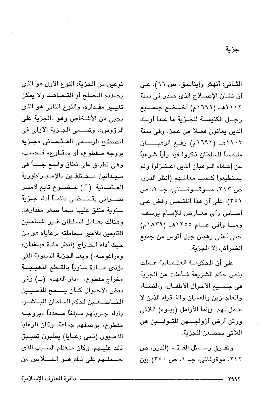 الثاني: آنهكر وإينالجق، ص 66). على أن نشان الإصلاح الذي صدر في سنة 1102 هـ (1691 م) أخضع جميع رجال الكنيسة للجزية ما عدا أولئك الذين يعانون فعلا من عجز. وفي سنة 1103 هـ (1692 م) رفع الرهبان ملتمسًا للسلطان ذكروا فيه رأيًا شرعيًا عن إعفاء الرهبان الذين اعتزلوا ولم يستطيعوا كسب معاشهم (انظر الدرر، ص 213، موقوفاتى، جـ 1، ص 351)، على أن هذا الملتمس رفض على أساس رأى معارض للإمام يوسف. وما وافى عام 1255 هـ (1839 م) حتى أعفى رهبان جبل أتوس من جميع الضرائب إلا الجزية.