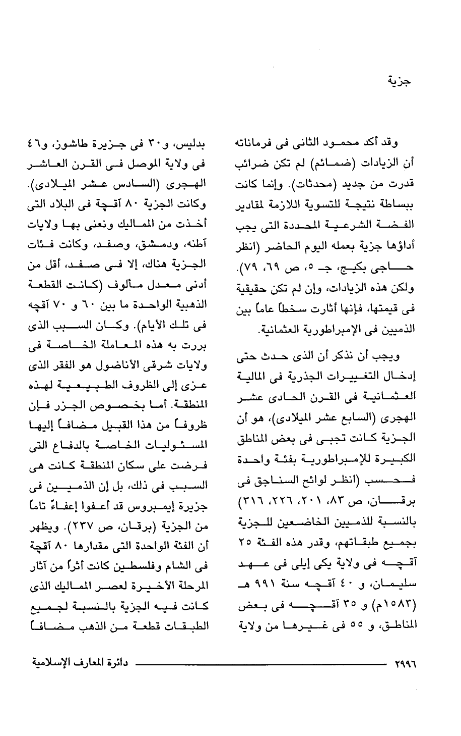 ويجب أن نذكر أن الذي حدث حتى إدخال التغييرات الجذرية في المالية العثمانية في القرن الحادي عشر الهجرى (السابع عشر الميلادي)، هو أن الجزية كانت تجبى في بعض المناطق الكبيرة للإمبراطورية بفئة واحدة فحسب (انظر لوائح السناجق في برقان، ص 83, 201, 226, 316) بالنسبة للذميين الخاضعين للجزية بجميع طبقاتهم، وقدر هذه الفئة 25 آقجه في ولاية يكى إيلى في عهد سليمان، و 40 آقجه سنة 991 هـ (1583 م) و 35 آقجه في بعض المناطق، و 55 في غيرها من ولاية بدليس، 30 في جزيرة طاشوز، و 46 في ولاية الموصل في القرن العاشر الهجرى (السادس عشر الميلادي). وكانت الجزية 80 آقجة في البلاد التي أخذت من المماليك ونعنى بها ولايات آطنه، ودمشق، وصفد، وكانت فئات الجزية هناك، إلا في صفد، أقل من أدنى معدل مألوف (كانت القطعة الذهبية الواحدة ما بين 60 و 70 آقجه في تلك الأيام). وكان السبب الذي بررت به هذه المعاملة الخاصة في ولايات شرقي الأناضول هو الفقر الذي عزى إلى الظروف الطبيعية لهذه المنطقة. أما بخصوص الجزر فإن ظروفًا من هذا القبيل مضافًا إليها المسئوليات الخاصة بالدفاع التي فرضت على سكان المنطقة كانت هي السبب في ذلك، بل إن الذميين قى جزيرة إيمبروس قد أعفوا إعفاءً تامًّا من الجزية (برقان، ص 237). ويظهر أن الفئة الوأحدة التي مقدارها 80 آقجة في الشام وفلسطين كانت أثرًا من آثار المرحلة الأخيرة لعصر المماليك الذي كانت فيه الجزية بالنسبة لجميع الطبقات قطعة من الذهب مضافًا