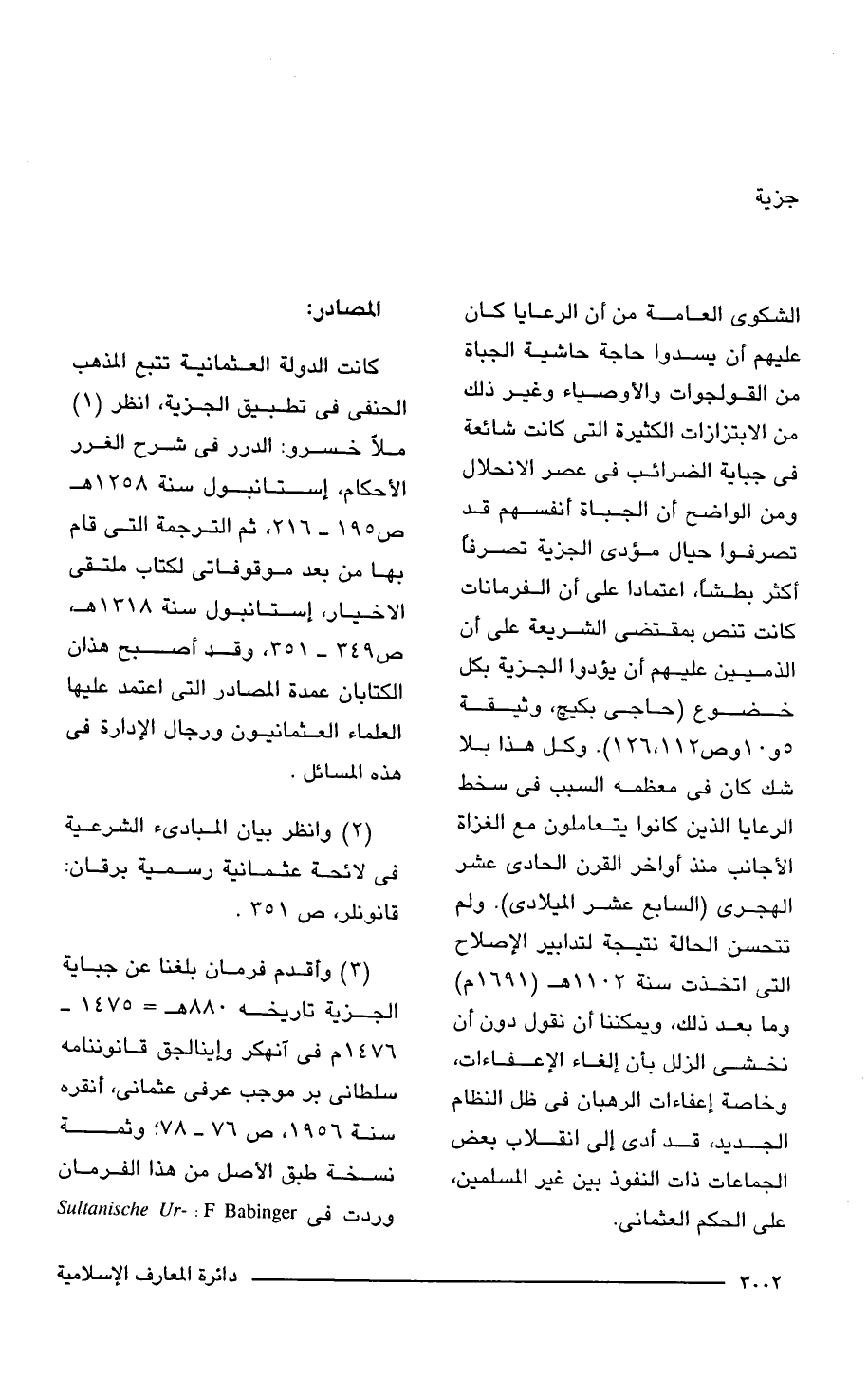(3) وأقدم فرمان بلغنا عن جباية الجزية تاريخه 880 هـ = 1475 - 1476 م في آنهكر وإينالجق قانوننامه سلطانى بر موجب عرفى عثمانى، أنقره سنة 1956، ص 76 - 78؛ وثمة نسخة طبق الأصل من هذا الفرمان وردت في Sultanische Ur-: Babinger