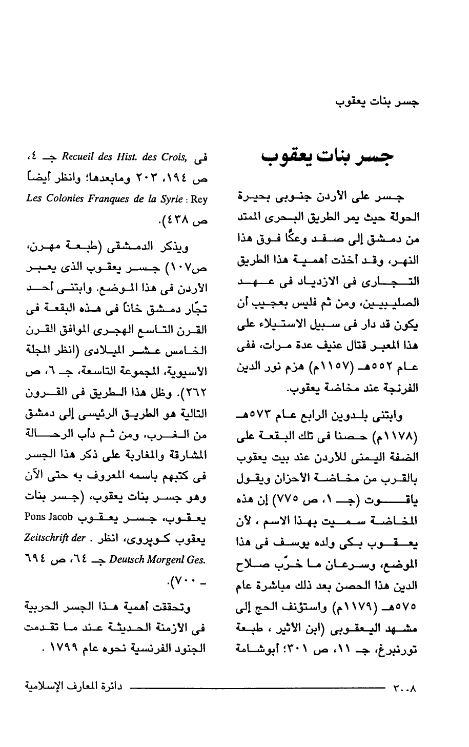 جسر على الأردن جنوبي بحيرة الحولة حيث يمر الطريق البحرى الممتد من دمشق إلى صفد وعكَّا فوق هذا النهر، وقد أخذت أهمية هذا الطريق التجارى في الازدياد في عهد الصليبيين، ومن ثم فليس بعجيب أن يكون قد دار في سبيل الاستيلاء على هذا المعبر قتال عنيف عدة مرات، ففي عام 552 هـ (1157 م) هزم نور الدين الفرنجة عند مخاضة يعقوب.