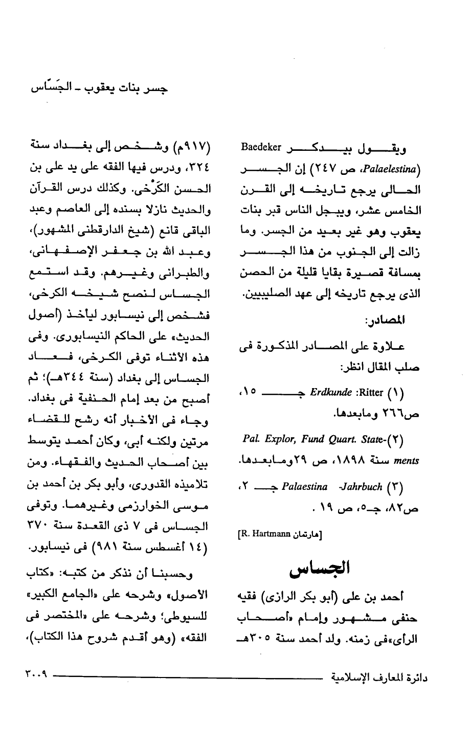 أحمد بن علي (أبو بكر الرازي) فقيه حنفى مشهور وإمام "أصحاب الرأي" في زمنه. ولد أحمد سنة 305 هـ جسر بنات يعقوب- الجَسّاس (917 م) وشخص إلى بغداد سنة 324, ودرس فيها الفقه على يد علي بن الحسن الكَرْخى. وكذلك درس القرآن والحديث نازلا بسنده إلى العاصم وعبد الباقي قانع (شيخ الدارقطني المشهور)، وعبد الله بن جعفر الإصفهانى، والطبراني وغيرهم. وقد استمع الجساس لنصح شيخه الكرخى، فشخص إلى نيسابور ليأخذي (أصول الحديث" على الحاكم النيسابورى. وفي هذه الأثناء توفى الكرخى، فعاد الجساس إلى بغداد (سنة 344 هـ)؛ ثم أصبح من بعد إمام الحنفية في بغداد. وجاء في الأخبار أنه رشح للقضاء مرتين ولكنه أبي، وكان أحمد يتوسط بين أصحاب الحديث والفقهاء. ومن تلاميذه القدوري, وأبو بكر بن أحمد بن موسى الخوارزمى وغيرهما. وتوفى الجساس في 7 ذي القعدة سنة. 370 (14 أغسطس سنة 981) في نيسابور.