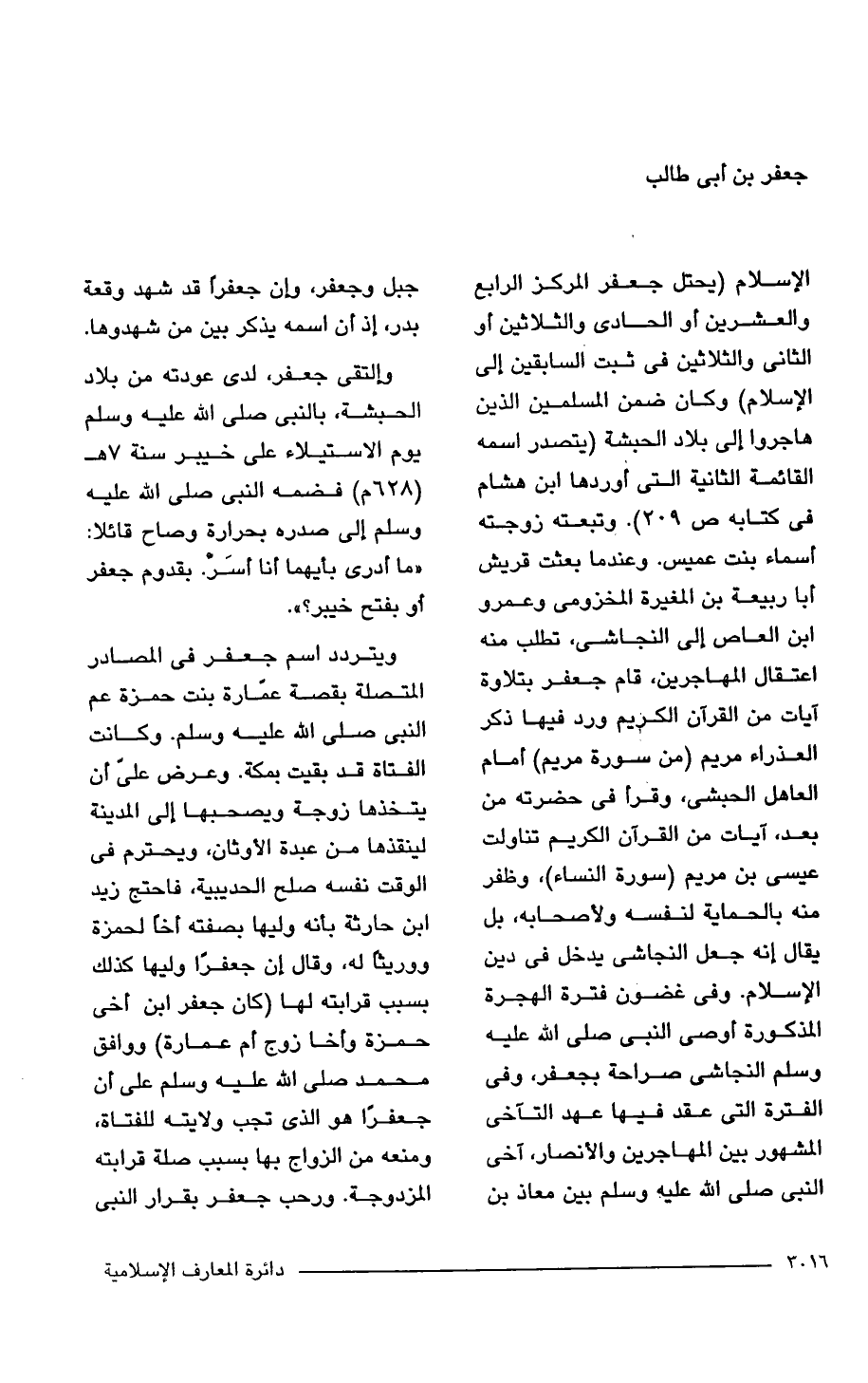 الإسلام (يحتل جعفر المركز الرابع والعشرين أو الحادي والثلاثين أو الثاني والثلاثين في ثبت السابقين إلى الإسلام) وكان ضمن المسلمين الذين هاجروا إلى بلاد الحبشة (يتصدر اسمه القائمة الثانية التي أوردها ابن هشام في كتابه ص 209). وتبعته زوجته أسماء بنت عميس. وعندما بعثت قريش أبا ربيعة بن المغيرة المخزومي ابن العاص إلى النجاشي، تطلب منه اعتقال المهاجرين، قام جعفر بتلاوة آيات من القرآن الكريم ورد فيها ذكر العذراء مريم (من سورة مريم) أمام العاهل الحبشى، وقرأ في حضرته من بعد، آيات من القرآن الكريم تناولت عيسى بن مريم (سورة النساء)، وظفر منه بالحماية لنفسه ولأصحابه، بل يقال إنه جعل النجاشي يدخل في دين الإسلام. وفي غضون فترة الهجرة المذكورة أوصى النبي صلى الله عليه وسلم النجاشي صراحة بجعفر، وفي الفترة التي عقد فيها عهد التآخى المشهور بين المهاجرين والأنصار، آخى النبي صلى الله عليبما وسلم بين معاذ بن جبل وجعفر، وإن جعفرًا قد شهد وقعة بدر، إذ أن اسمه يذكر بين من شهدوها.