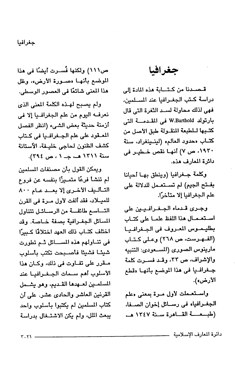 قصدنا من كتابة هذه المادة إلى دراسة كتب الجغرافيا عند المسلمين، فهي لذلك محاولة لسد الثغرة التي قال بارتولد W.Barthold المقدمة التي كتبها للطبعة المنقولة طبق الأصل من كتاب "حدود العالم" (لينينغراد، سنة 1930, ص 7) أنها نقص خطير في دائرة المعارف هذه.