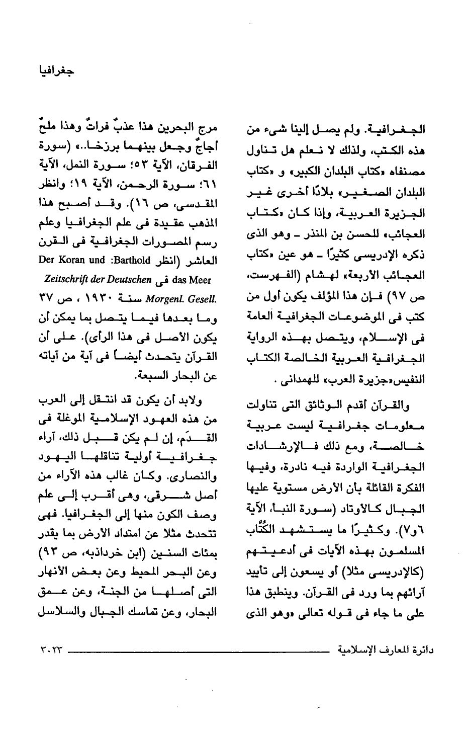 والقرآن أقدم الوثائق التي تناولت معلومات جغرافية ليست عربية خالصة، ومع ذلك فالإرشادات الجغرافية الواردة فيه نادرة، وفيها الفكرة القائلة بأن الأرض مستوية عليها الجبال كالأوتاد (سورة النبأ، الآية 6 و 7). وكثيرًا ما يستشهد الكُتَّاب المسلمون بهذه الآيات في أدعيتهم (كالإدريسى مثلًا) أو يسعون إلى تأييد آرائهم بما ورد في القرآن. وينطبق هذا على ها جاء في قوله تعالى "وهو الذي مرج البحرين هذا عذبٌ فراتٌ وهذا ملحٌ أجاجٌ وجعل بينهما برزخا .. " (سورة الفرقان، الآية 53؛ سورة النمل، الآية 61؛ سورة الرحمن، الآية 19؛ وانظر المقدسي، ص 16). وقد أصبح هذا المذهب عقيدة في علم الجغرافيا وعلم رسم المصورات الجغرافية في القرن العاشر (انظر Der Koran and: Barthold das Meer في Zeitschrift der Deutschen .Gesell . Morgenl سنة 1930, ص 37 وما بعدها فيما يتصل بما يمكن أن يكون الأصل في هذا الرأى). على أن القرآن يتحدث أيضًا في آية من آياته عن البحار السبعة.