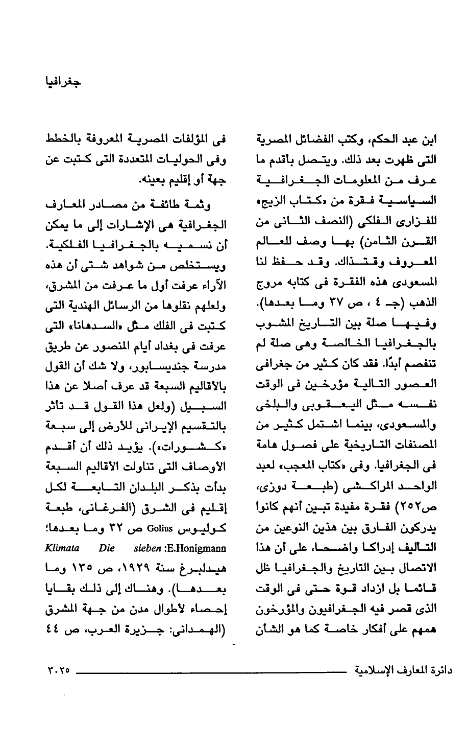 ابن عبد الحكم، وكتب الفضائل المصرية التي ظهرت بعد ذلك. ويتصل بأقدم ما عرف من المعلومات الجغرافية السياسية فقرة من "كتاب الزيج"، للفزارى الفلكى (النصف الثاني من القرن الثامن) بها وصف للعالم المعروف وقتذاك. وقد حفظ لنا المسعودى هذه الفقرة في كتابه مروج الذهب (جـ 4، ص 37 وما بعدها). وفيها صلة بين التاريخ المشوب بالجغرافيا الخالصة وهي صلة لم تنفصم أبدًا. فقد كان كثير من جغرافي العصور التالية مؤرخين في الوقت نفسه مثل اليعقوبى والبلخى والمسعودى، بينما اشتمل كثير من المصنفات التاريخية على فصول هامة في الجغرافيا. وفي "كتاب المعجب، لعبد الواحد المراكشى (طبعة دوزى، ص 252) فقرة مفيدة تبين أنهم كانوا يدركون الفارق بين هذين النوعين من التأليف إدراكا واضحا، على أن هذا الاتصال بين التاريخ والجغرافيا ظل قائما بل ازداد قوة حتى في الوقت الذي قصر فيه الجغرافيون والمؤرخون همهم على أفكار خاصة كما هو الشأن في المؤلفات المصرية المعروفة بالخطط وفي الحوليات المتعددة التي كتبت عن جهة أو إقليم بعينه.