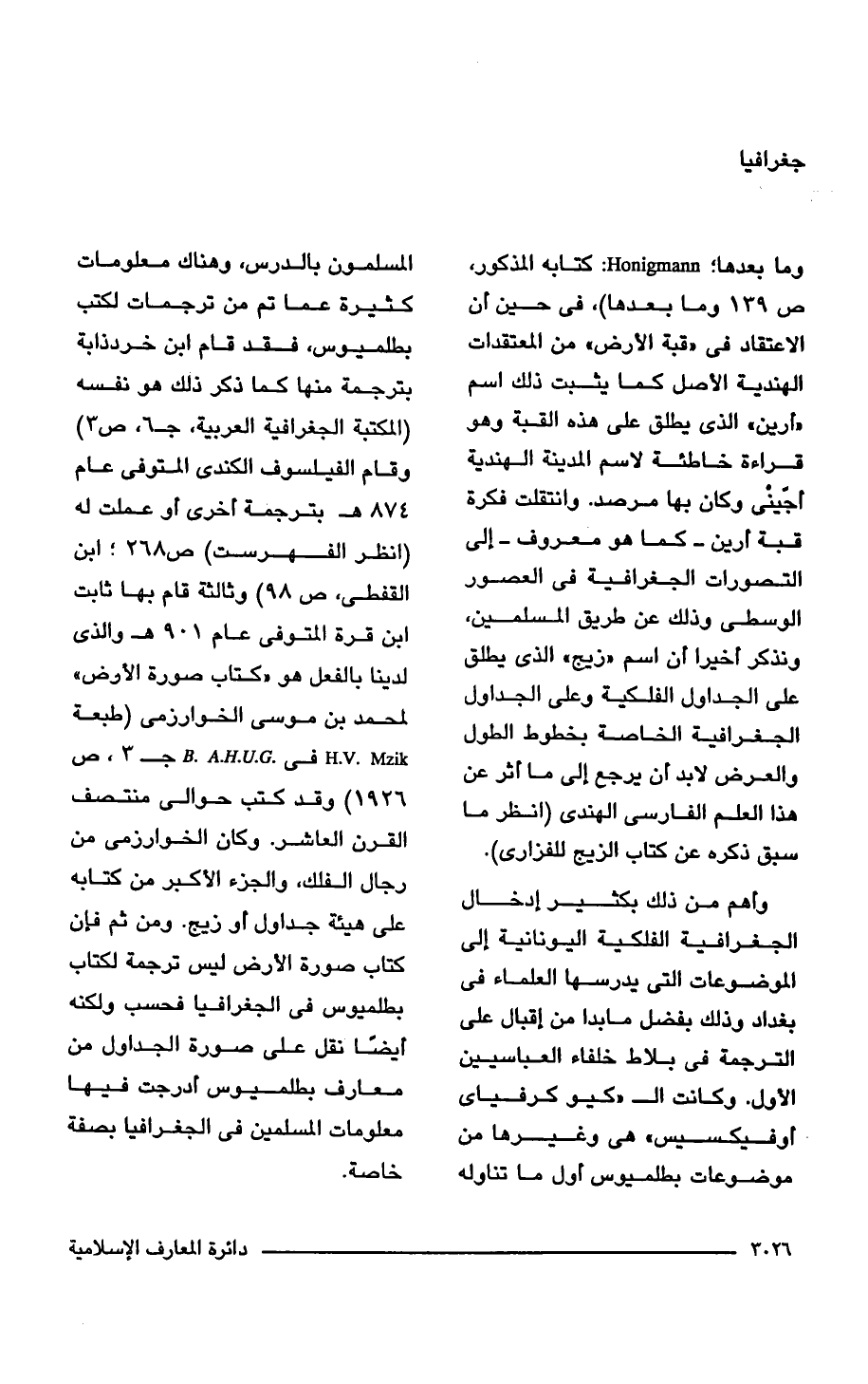 وما بعدها؛ Honigmann: كتابه المذكور، ص 139 وما بعدها)، في حين أن الاعتقاد في "قبة الأرض" من المعتقدات الهندية الأصل كما يثبت ذلك اسم "أرين" الذي يطلق على هذه القبة وهو قراءة خاطئة لاسم المدينة الهندية أجّينْى وكان بها مرصد. وانتقلت فكرة قبة أرين -كما هو معروف- إلى التصورات الجغرافية في العصور الوسطى وذلك عن طريق المسلمين، ونذكر أخيرا أن اسم "زيج" الذي يطلق على الجداول الفلكية وعلى الجداول الجغرافية الخاصة بخطوط الطول والعرض لا بد أن يرجع إلى ما أثر عن هذا العلم الفارسى الهندى (انظر ما سبق ذكره عن كتاب الزيج للفزارى).