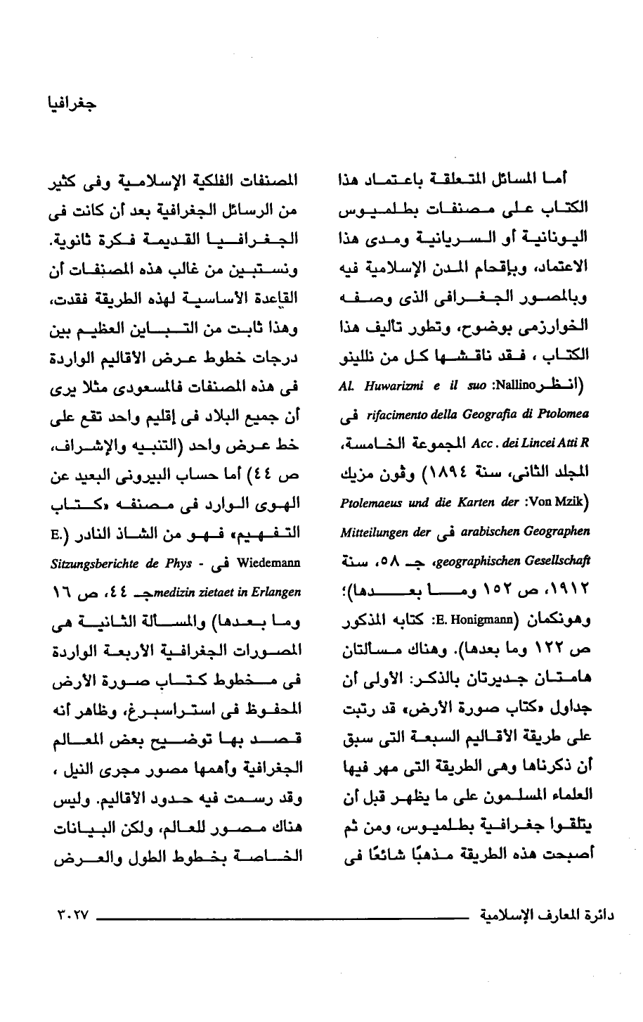 اما المسائل المتعلقة باعتماد هذا الكتاب على مصنفات بطلميوس اليونانية أو السريانية ومدى هذا الاعتماد، وبإقحام المدن الإسلامية فيه وبالمصور الجغرافي الذي وصفه الخوارزمى بوضوح، وتطور تأليف هذا الكتاب، فقد ناقشها كل من نللينو (انظر e il suo: Nalllno AL. Huwarinni della Geografia di Ptolomea rifacimento في R Acc. dei Lincei Atti المجموعة الخامسة، المجلد الثاني، سنة 1894) وفون مزيك (Mzik Ptolemaeus and die Karten der: Von arabischen Geographer في Mitteilungen der geographischen GeseUschaft، جـ 58، سنة 1912, ص 152 وما بعدها)؛ وهونكمان (E. Honigmann: كتابه المذكور ص 122 وما بعدها). وهناك مسألتان هامتان جديرتان بالذكر: الأولى أن جداول "كتاب صورة الأرض" قد رتبت على طريقة الأقاليم السبعة التي سبق أن ذكرناها وهي الطريقة التي مهر فيها العلماء المسلمون على ما يظهر قبل أن يتلقوا جغرافية بطلميوس، ومن ثم أصبحت هذه الطريقة مذهبًا شائعًا في المصنفات الفلكية الإسلامية وفي كثير من الرسائل الجغرافية بعد أن كانت في الجغرافيا القديمة فكرة ثانوية. ونستبين من غالب هذه المصنفات أن القاعدة الأساسية لهذه الطريقة فقدت، وهذا ثابت من التباين العظيم بين درجات خطوط عرض الأقاليم الواردة في هذه المصنفات فالمسعودى مثلًا يرى أن جميع البلاد في إقليم واحد تقع على خط عرض واحد (التنبيه والإشراف، ص 44) أما حساب البيرونى البعيد عن الهوى الوارد في مصنفه "كتاب التفهيم" فهو من الشاذ النادر (E. Sitzungsberichte de Phys - Wiedemann zietaet in Erlangen . medizrn جـ 44، ص 16 وما بعدها) والمسألة الثانية هي المصورات الجغرافية الأربعة الواردة في مخطوط كتاب صورة الأرض المحفوظ في استراسبرغ، وظاهر أنه قصد بها توضيح بعض المعالم الجغرافية وأهمها مصور مجرى النيل، وقد رسمت فيه حدود الأقاليم. وليس هناك مصور للعالم، ولكن البيانات الخاصة بخطوط الطول والعرض