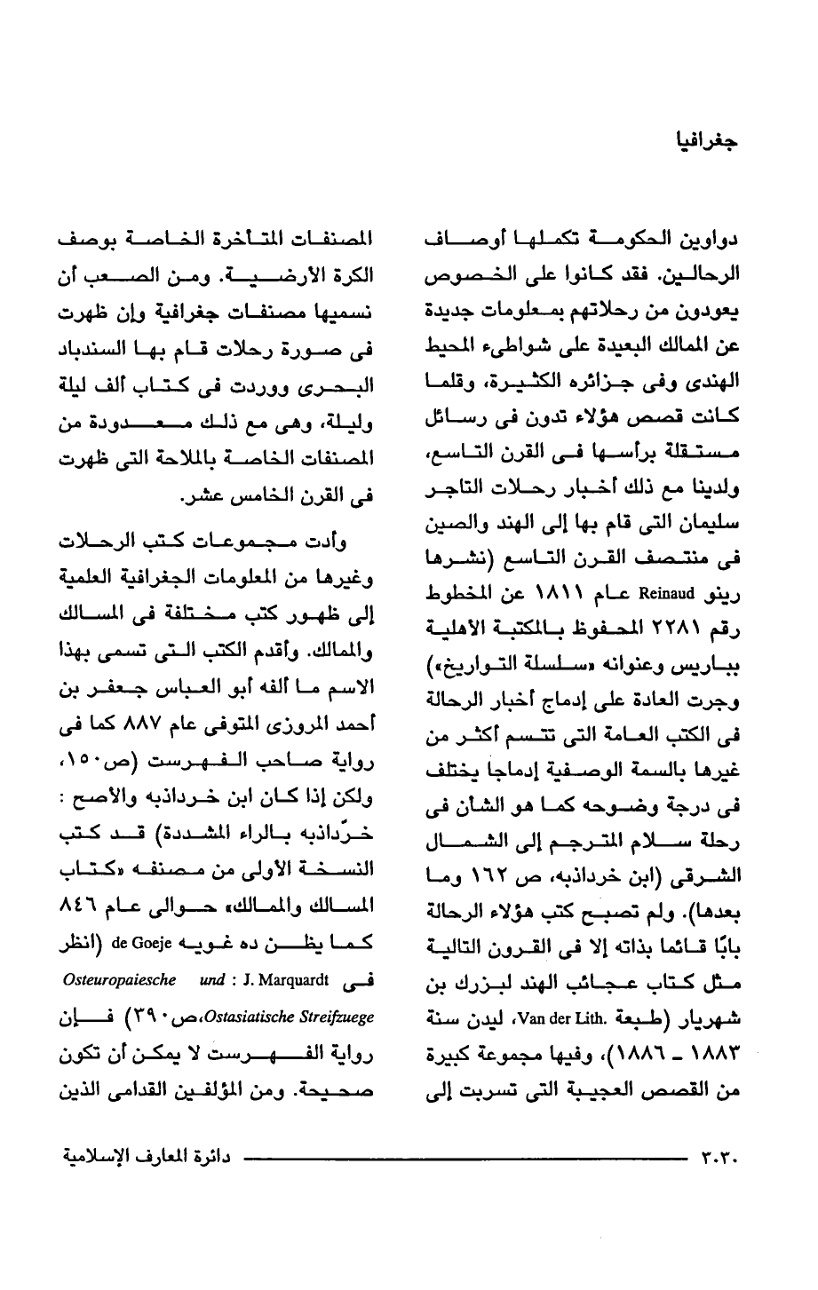دواوين الحكومة تكملها أوصاف الرحالين. فقد كانوا على الخصوص يعودون من رحلاتهم بمعلومات جديدة عن الممالك البعيدة على شواطئ المحيط الهندى وفي جزائره الكثيرة، وقلما كانت قصص هؤلاء تدون في رسائل مستقلة برأسها في القرن التاسع، ولدينا مع ذلك أخبار رحلات التاجر سليمان التي قام بها إلى الهند والصين في منتصف القرن التاسع (نشرها رينو Reinaud عام 1811 عن المخطوط رقم 2281 المحفوظ بالمكتبة الأهلية بباريس وعنوانه "سلسلة التواريخ") وجرت العادة على إدماج أخبار الرحالة في الكتب العامة التي تتسم أكثر من غيرها بالسمة الوصفية إدماجا يختلف في درجة وضوحه كما هو الشأن في رحلة سلام المترجم إلى الشمال الشرقي (ابن خرداذبه، ص 162 وما بعدها). ولم تصبح كتب هؤلاء الرحالة بابا قائما بذاته إلا في القرون التالية مثل كتاب عجائب الهند لبزرك بن شهريار (طبعة. Van der Lith، ليدن سنة 1883 - 1886) , وفيها مجموعة كبيرة من القصص العجيبة التي تسربت إلى المصنفات المتأخرة الخاصة بوصف الكرة الأرضية. ومن الصعب أن نسميها مصنفات جغرافية وإن ظهرت في صورة رحلات قام بها السندباد البحرى ووردت في كتاب ألف ليلة وليلة، وهي مع ذلك معدودة من المصنفات الخاصة بالملاحة التي ظهرت في القرن الخامس عشر.