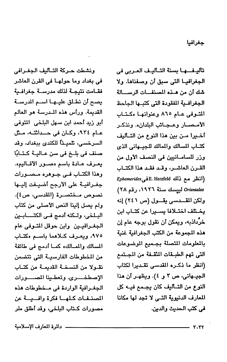 تأليفها بسنة التأليف العربي في الجغرافيا التي سبق أن وصفناها. ولا شك أن من هذه المصنفات الرسالة الجغرافية المفقودة التي كتبها الجاحظ المتوفى عام 865 وعنوانها "كتاب الأمصار وعجائب البلدان". ونذكر أخيرا من بين هذا النوع من التأليف كتاب المسالك والممالك للجيهانى الذي وزر للسامانيين في النصف الأول من القرن العاشر، وقد فقد هذا الكتاب (انظر مع ذلك E. Herzfeld في Ephemerides Orientates ليبسك سنة 1926, رقم 28) ولكن المقدسي يقول (ص 241) إنه يختلف اختلافا يسيرا عن كتاب ابن خرَّداذبه، ويمكن أن نقول بوجه عام إن هذه المجموعة من الكتب الجغرافية غنية بالمعلومات المتصلة بجميع الموضوعات التي تهم الطبقات المثقفة من المجتمع (انظر ما ذكره المقدسي تقديرا لكتاب الجيهانى، ص 3 و 4). ويظهر أن هذا النوع من التأليف كان يجمع فيه كل المعارف الدنيوية التي لا تجد لها مكانا في كتب الحديث والدين.