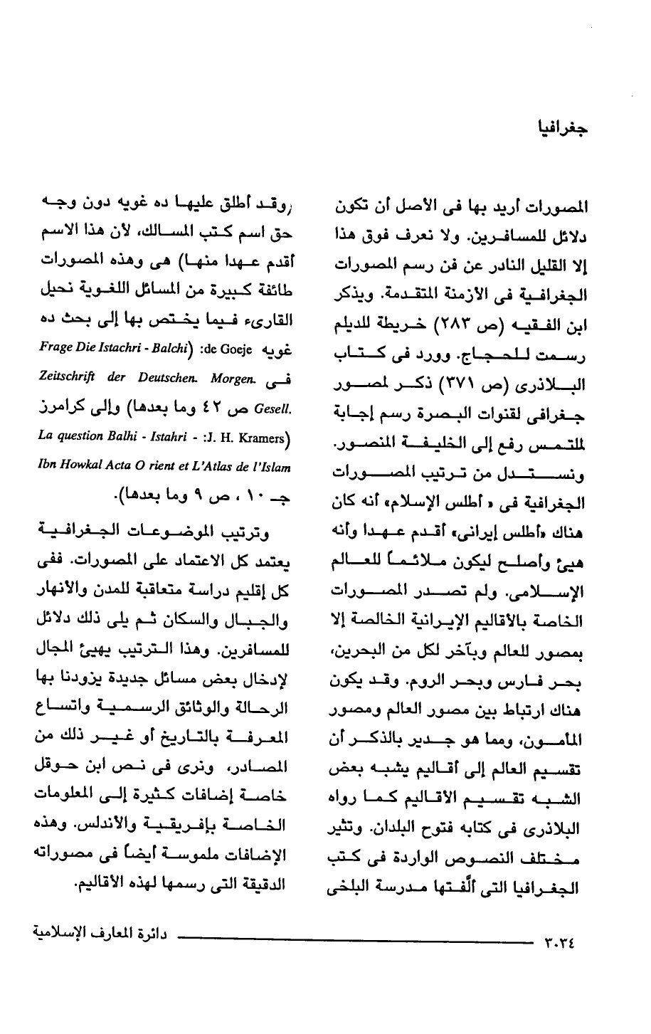 المصورات أريد بها في الأصل أن تكون دلائل للمسافرين. ولا نعرف فوق هذا إلا القليل النادر عن فن رسم المصورات الجغرافية في الأزمنة المتقدمة. ويذكر ابن الفقيه (ص 283) خريطة للديلم رسمت للحجاج. وررد في كتاب البلاذرى (ص 371) ذكر لمصور جغرافي لقنوات البصرة رسم إجابة لملتمس رفع إلى الخليفة المنصور. ونستدل من ترتيب المصورات الجغرافية في "أطلس الإسلام" أنه كان هناك "أطلس إيرانى" أقدم عهدا وأنه هيئ واصلح ليكون ملائمًا للعالم الإسلامي. ولم تصدر المصورات الخاصة بالأقاليم الإيرانية الخالصة إلا بمصور للعالم وبآخر لكل من البحرين، بحر فارس وبحر الروم. وقد يكون هناك ارتباط بين مصور العالم ومصور المأمون، ومما هو جدير بالذكر أن تقسيم العالم إلى أقاليم يشبه بعض الشبه تقسيم الأقاليم كما رواه البلاذرى في كتابه فتوح البلدان. وتثير مختلف النصوص الواردة في كتب الجغرافيا التي ألَّفتها مدرسة البلخى وقد أطلق عليها ده غويه دون وجه حق اسم كتب المسالك، لأن هذا الاسم أقدم عهدا منها) هي وهذه المصورات طائفة كبيرة من المسائل اللغوية نحيل القارئ فيما يختص بها إلى بحث ده غويه Frage Die Istachri - Balchi): de Goeje في der Deutschen. Morgen Zeitschrift .Gesell ص 42 وما بعدها) وإلى كرامرز (La question Balhi - Istahri -: J. H. Kramers .de l'Islam Acta O rient et L'Atlas Ibn Howkal جـ 10، ص 9 وما بعدها).